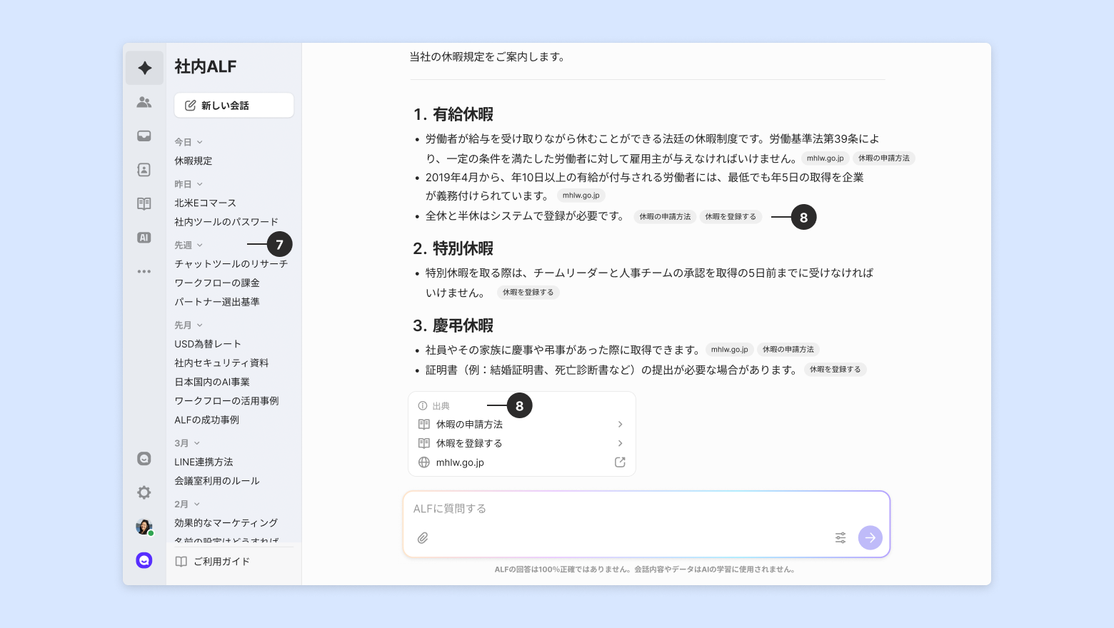 自動検索:社内ALFが質問の意図を把握し、最も適切な出典を自ら判断して回答します。