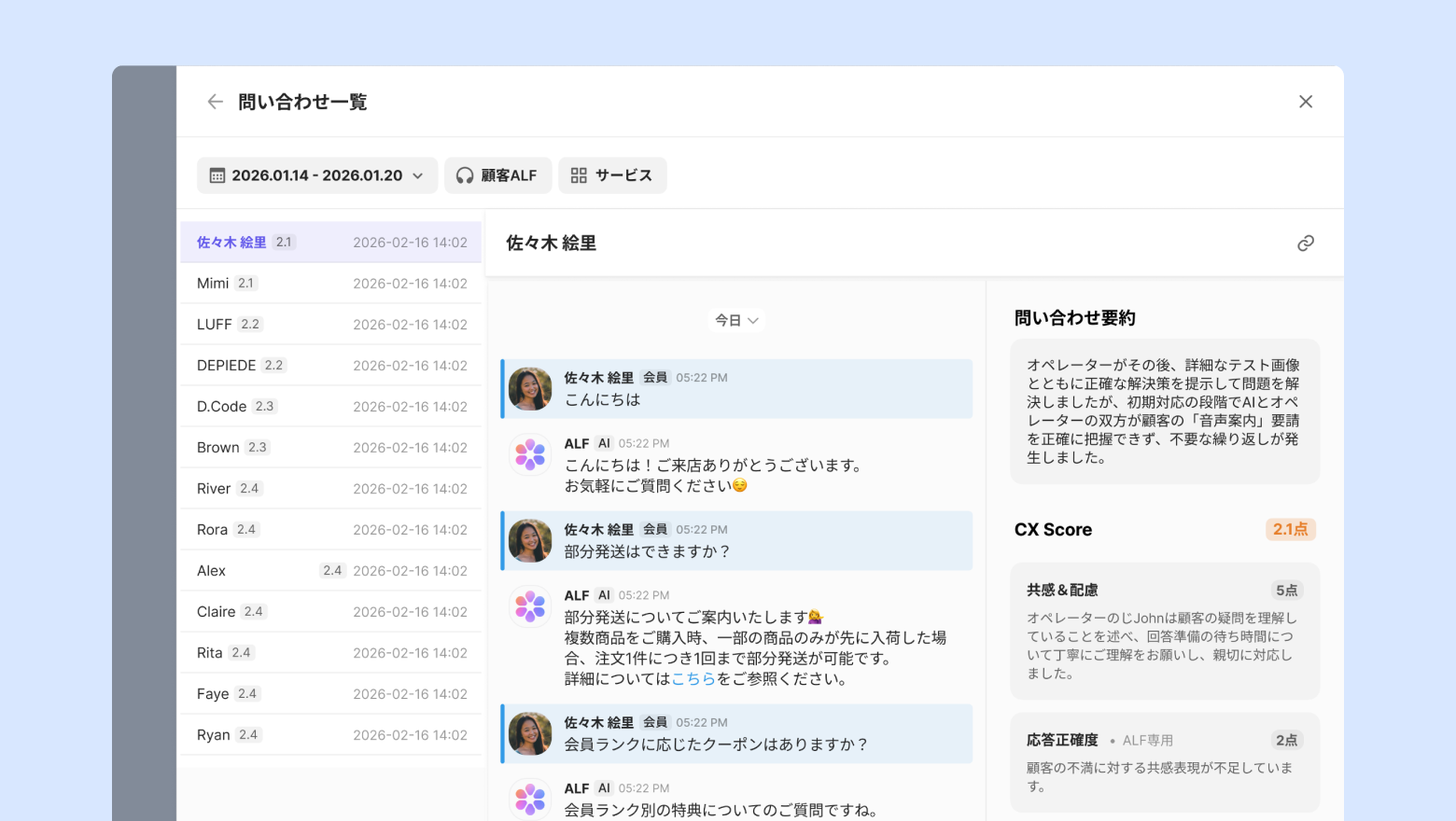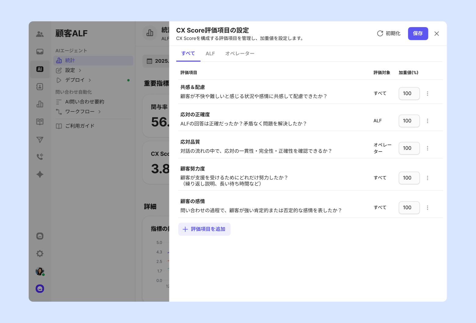 ALF応対とオペレーター対応は、同一のCX Scoreで測定されます。ただし、オペレーターの対応には「応答の正確度」ではなく、会話の流れに基づく「応対品質」の基準が適用されます。
