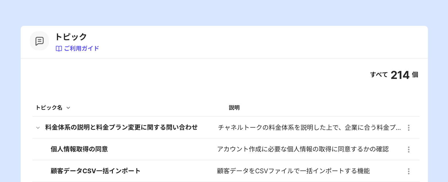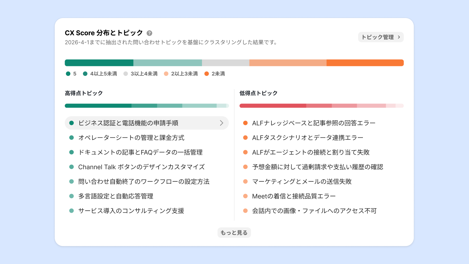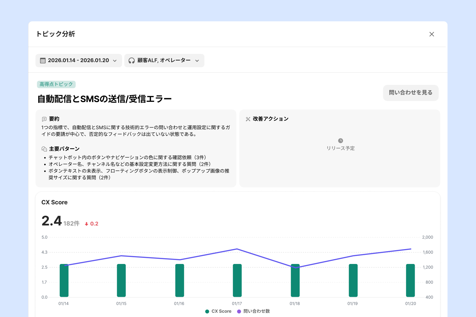 問い合わせが終了すると、AIが類似するテーマの問い合わせを自動でまとめてトピックに分類し、CX Scoreが低いトピックを一目で把握できるように整理します。数百件の問い合わせを1つずつ確認する必要がありません。