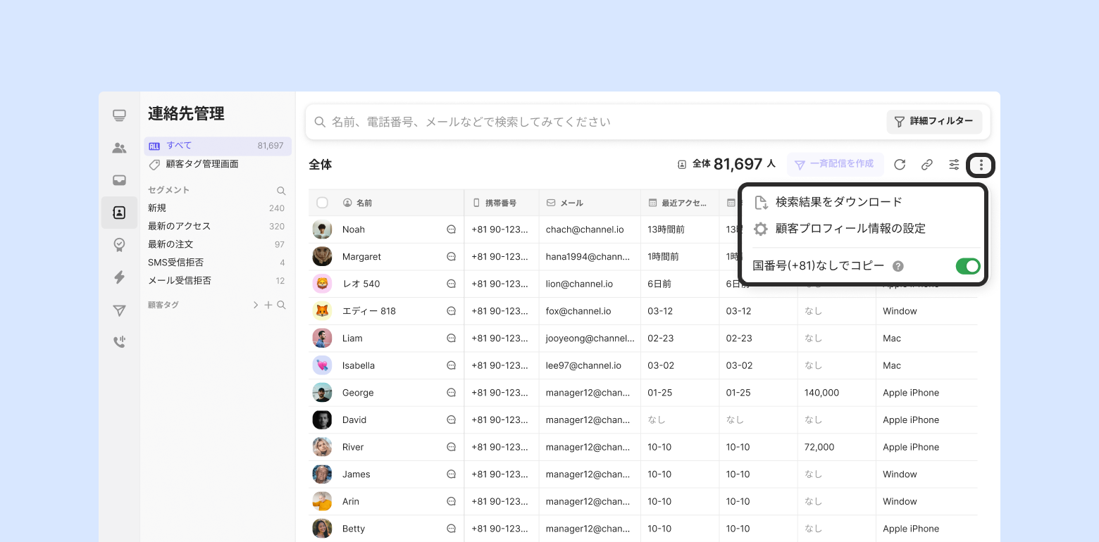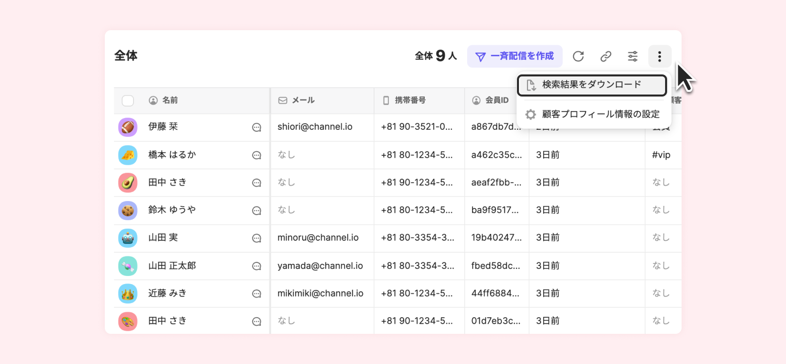 検索結果をダウンロード:全体顧客またはフィルタリングした結果をダウンロードできます。(→ダウンロード方法を見る)