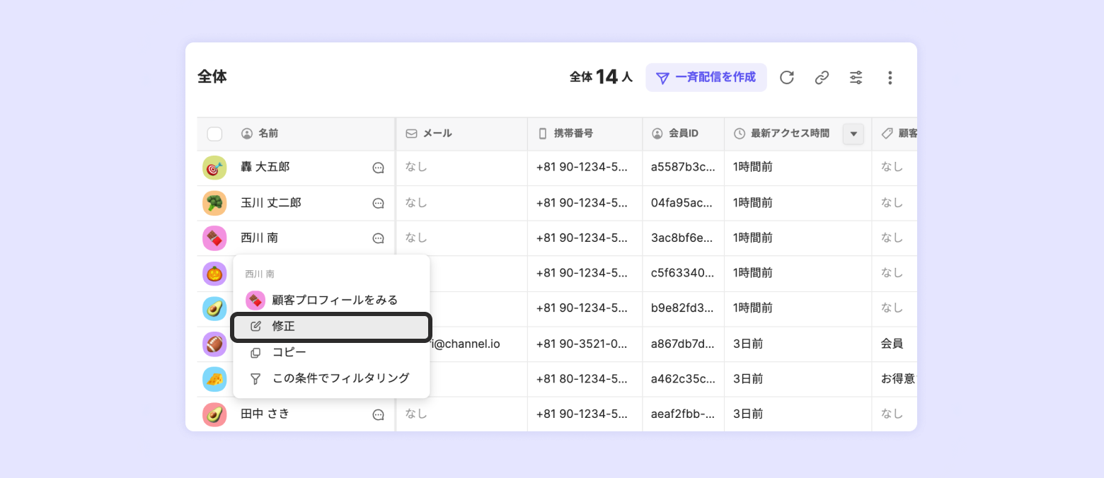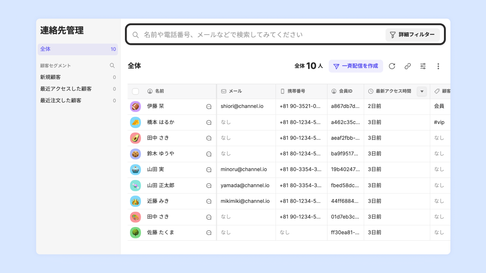 検索バーで名前・携帯番号・メールアドレスなどを入力し、顧客情報を素早く検索できます。