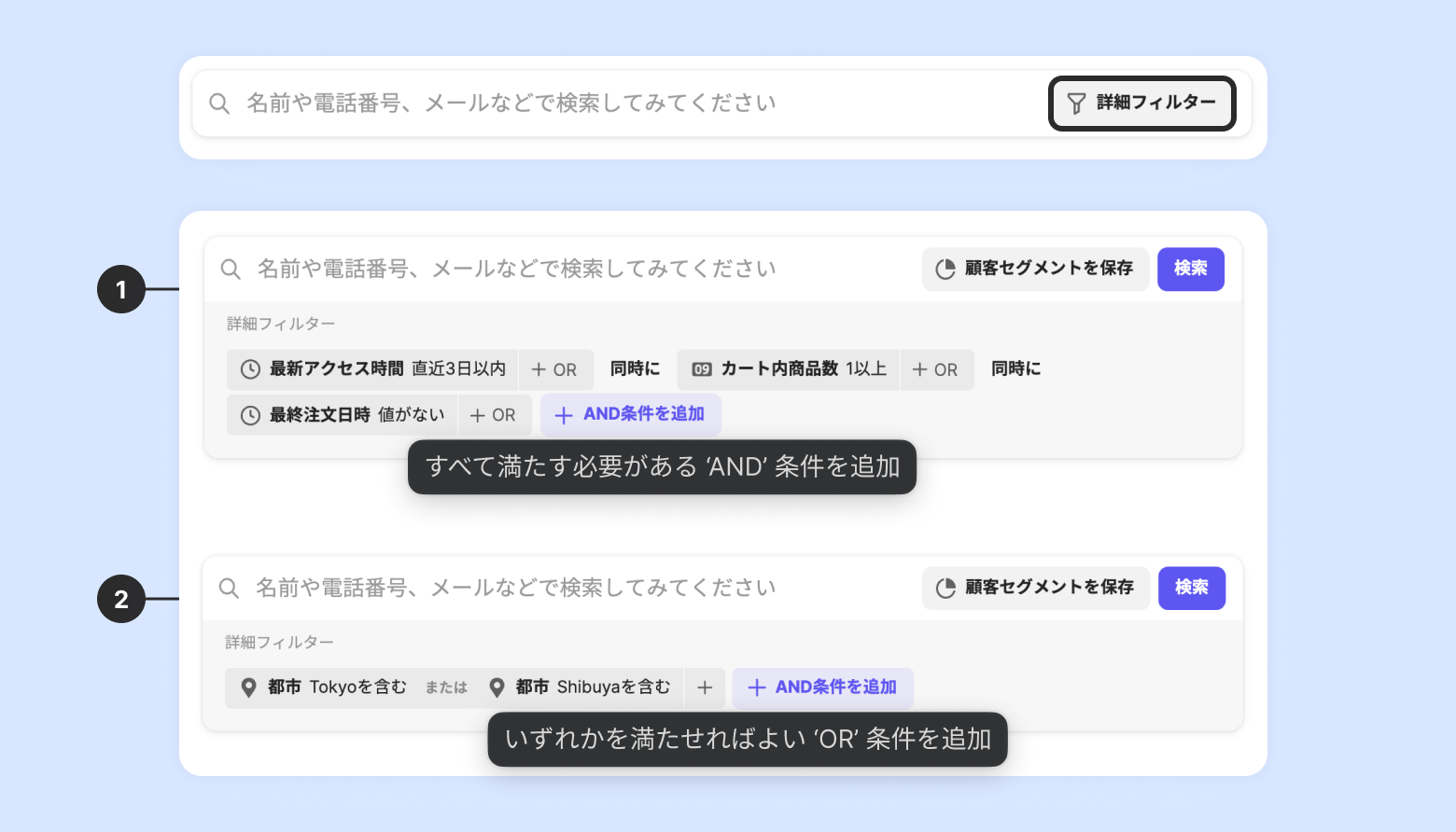 複数の条件の内、1つでも該当している顧客を検索したい場合は OR(または) で設定してください。