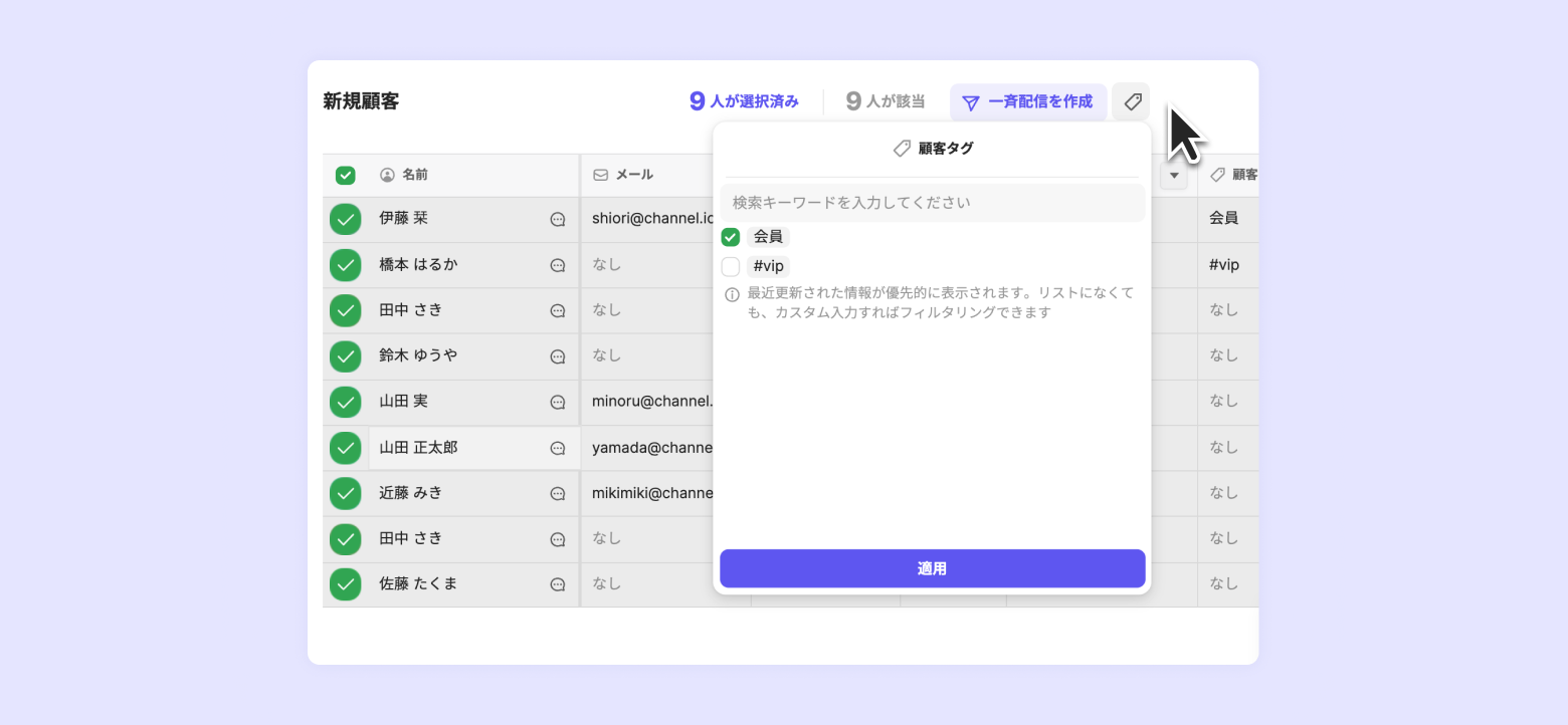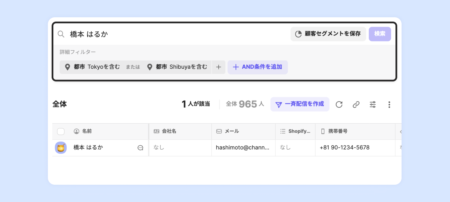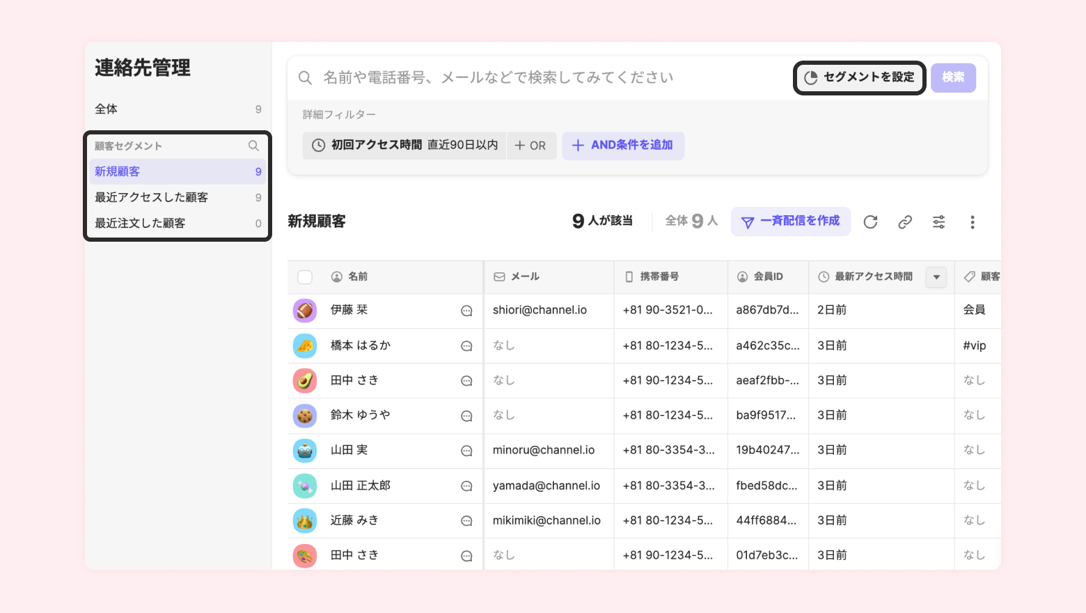 設定したフィルタリング条件のまま、いつでも顧客情報を呼び出せるようにセグメントを設定することができます。