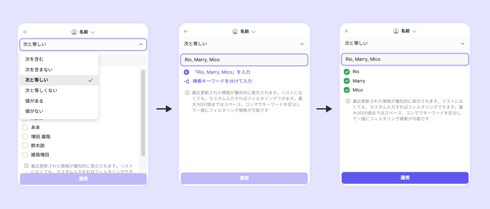 方法:"次と等しい" - コンマ(,)または分かち書きでデータを区分して入力 - [検索キーワードを分けて入力] クリック