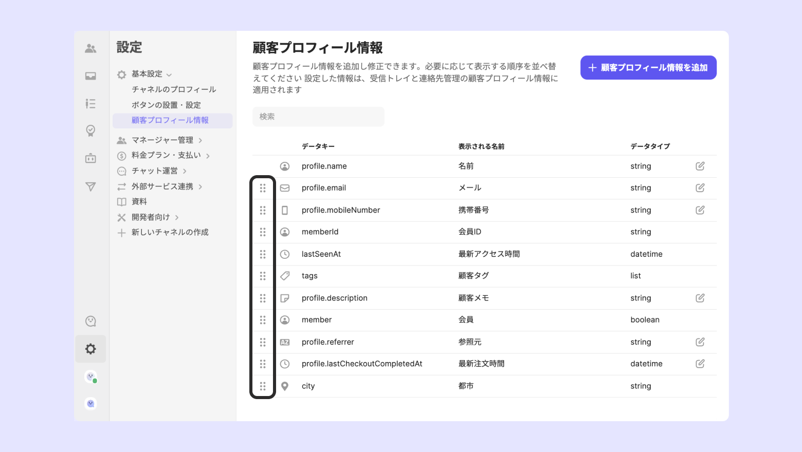 方法:[チャネル設定] - [基本設定] - [顧客プロフィール情報]