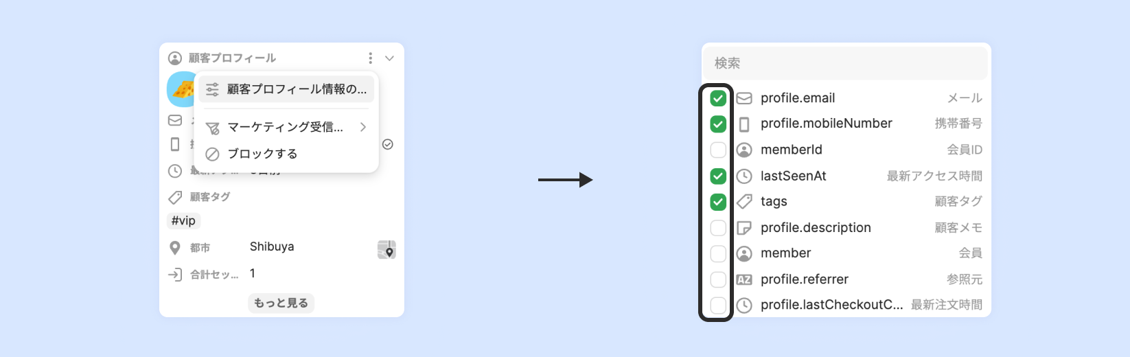顧客プロフィール情報の設定:連絡先管理で表示されるデータ項目の順番や表示有無を設定できます。(→データの順番変更を見る)