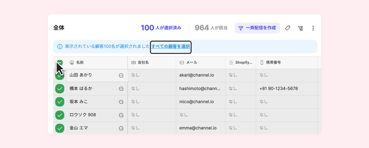 [すべての顧客を選択する] をクリックすると、スクロールなしで検索されたすべての顧客を選択できます。