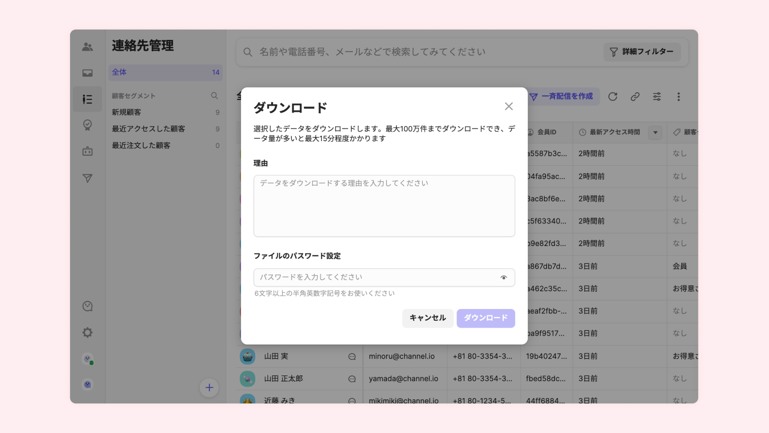 フィルタリングと選択なしで全体の顧客データをダウンロード可能です。(最大100万件まで)