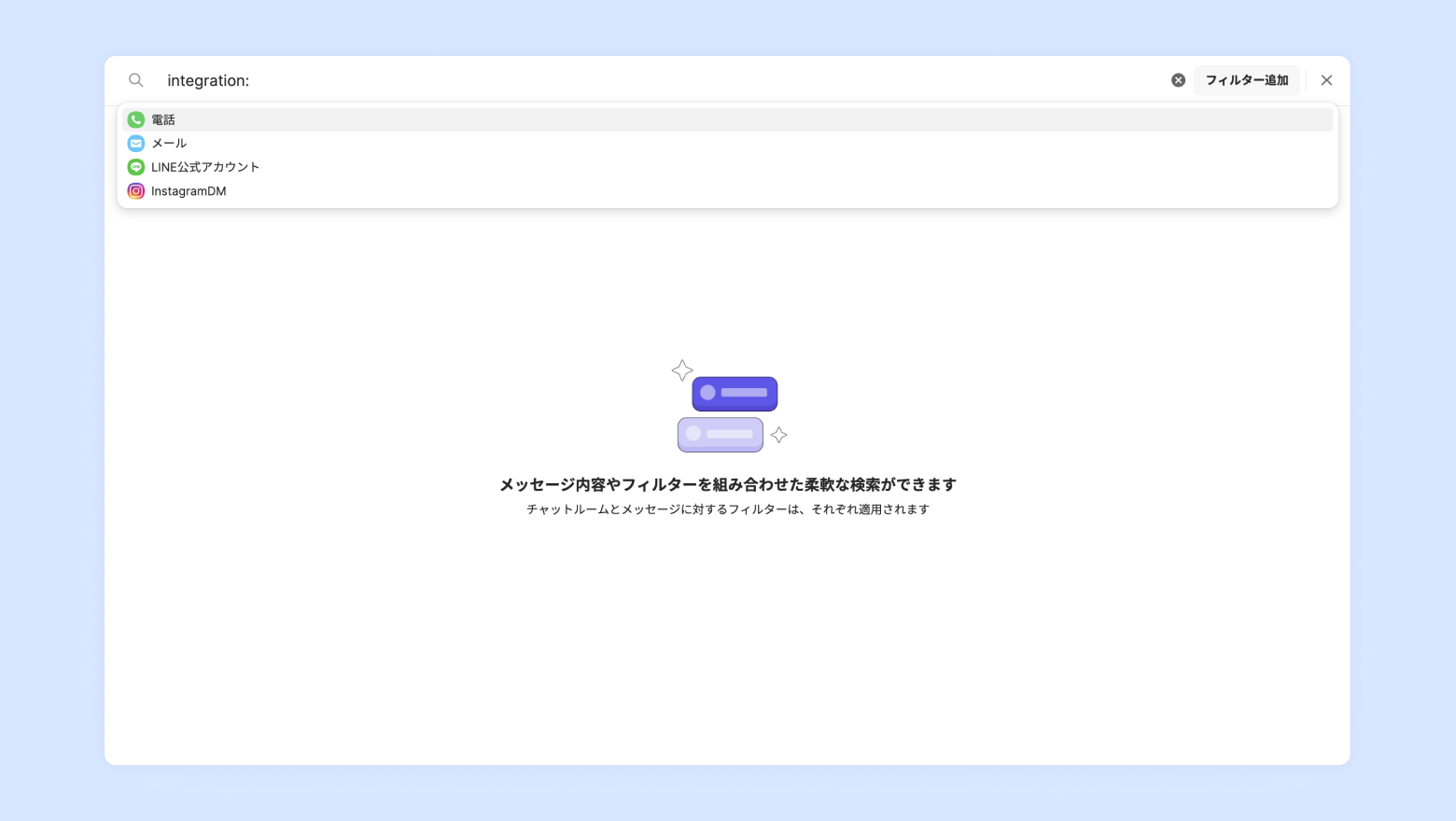 検索時のフィルタリング条件で [連携サービス] - [電話] を選択すると電話にて流入したチャットだけを確認することができます。