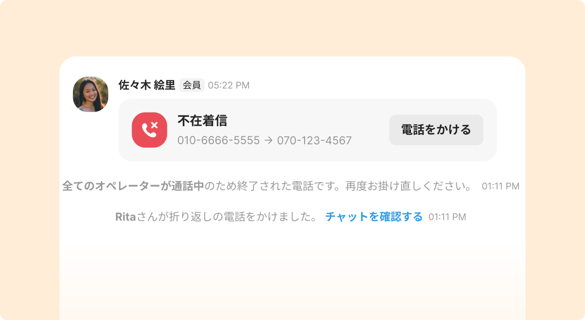 担当者と電話が接続せずに終了した不在着信のチャットルームで、不在だった理由を確認することができます。