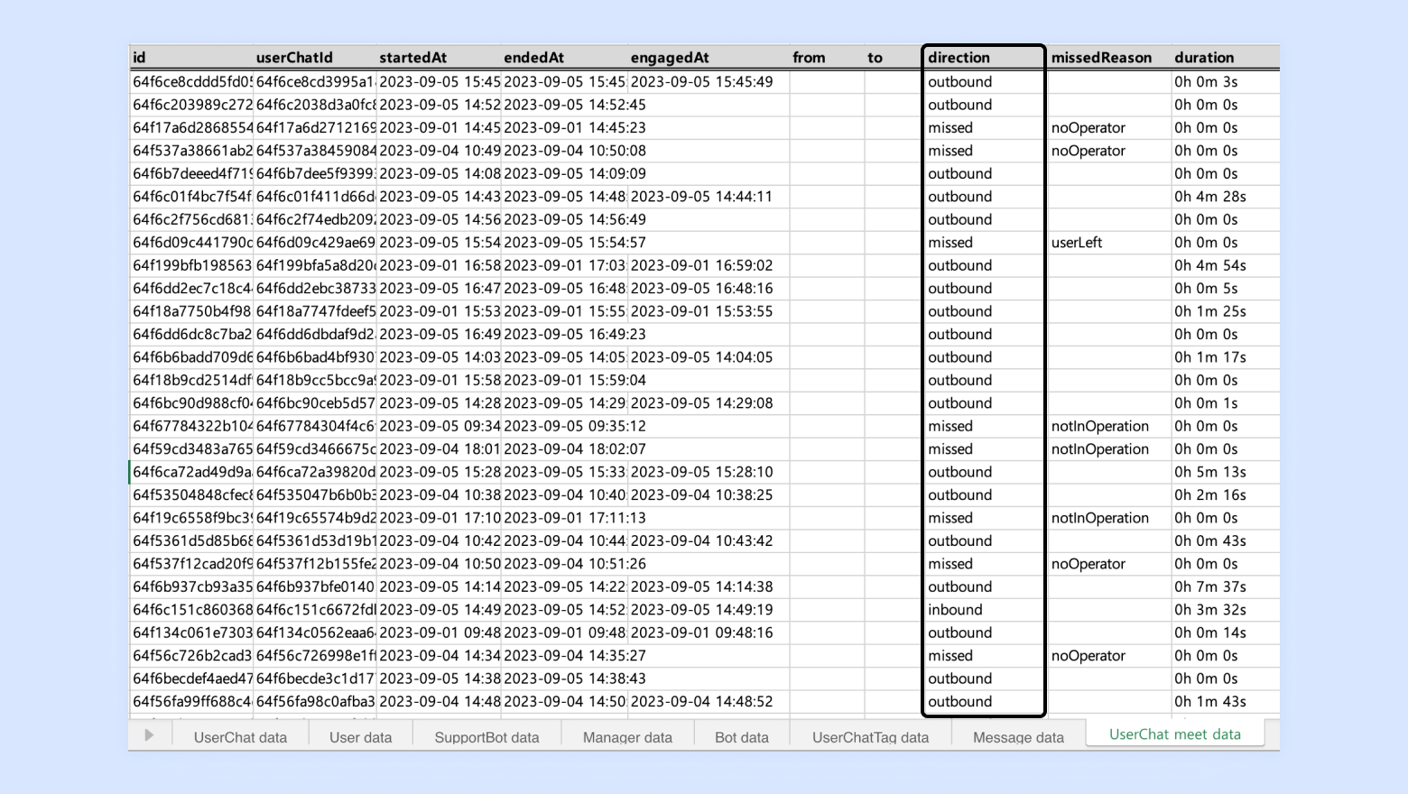 directionカラム(列)でインバウンド/アウトバウンドコール区分を確認可能