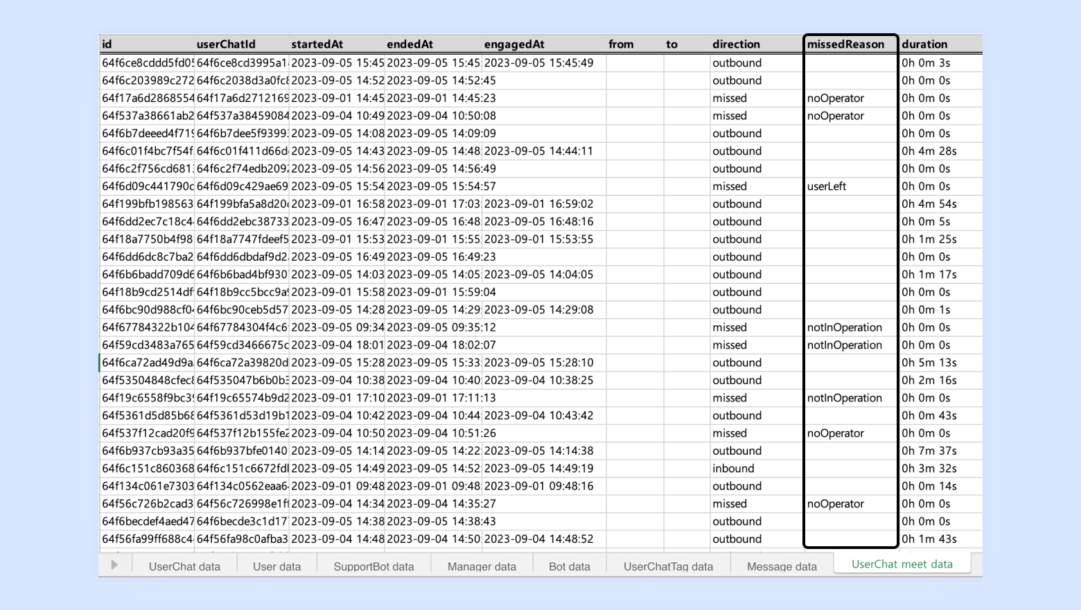 missed Reasonカラム(列)に事由が記載されている場合は不在コール