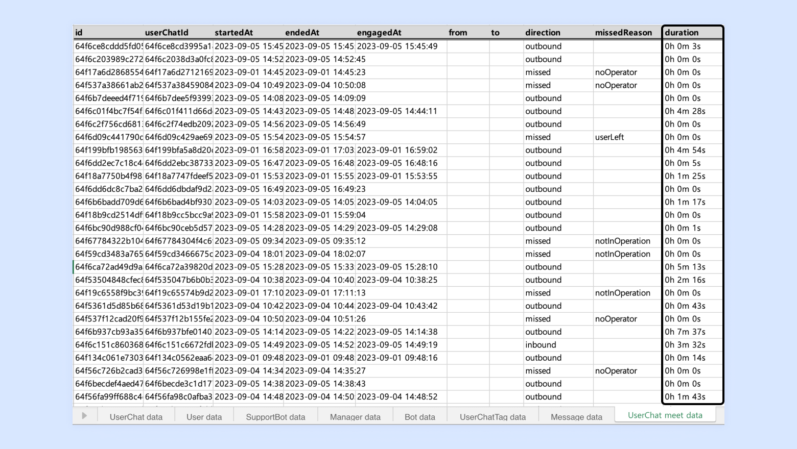 接客チャット統計のダッシュボードでは、電話の問い合わせが期間ごとに何件流入しているかを確認できます。 接客チャット統計からraw dataをダウンロードすると、インバウンド/アウトバウンド/留守番コールを確認することが可能です。統計内容は今後も改善をしていくので、統計で確認が必要なデータがあればご要望をいただけると嬉しいです:)