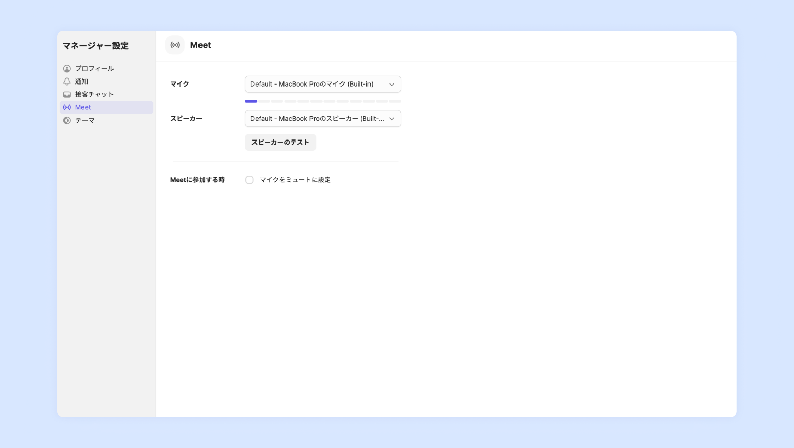[アカウント設定] - [個人設定] - [Meet] - [電話に参加する時 マイクをミュートに設定] をオンにしておくと、電話に参加した時にミュート状態で開始できます。