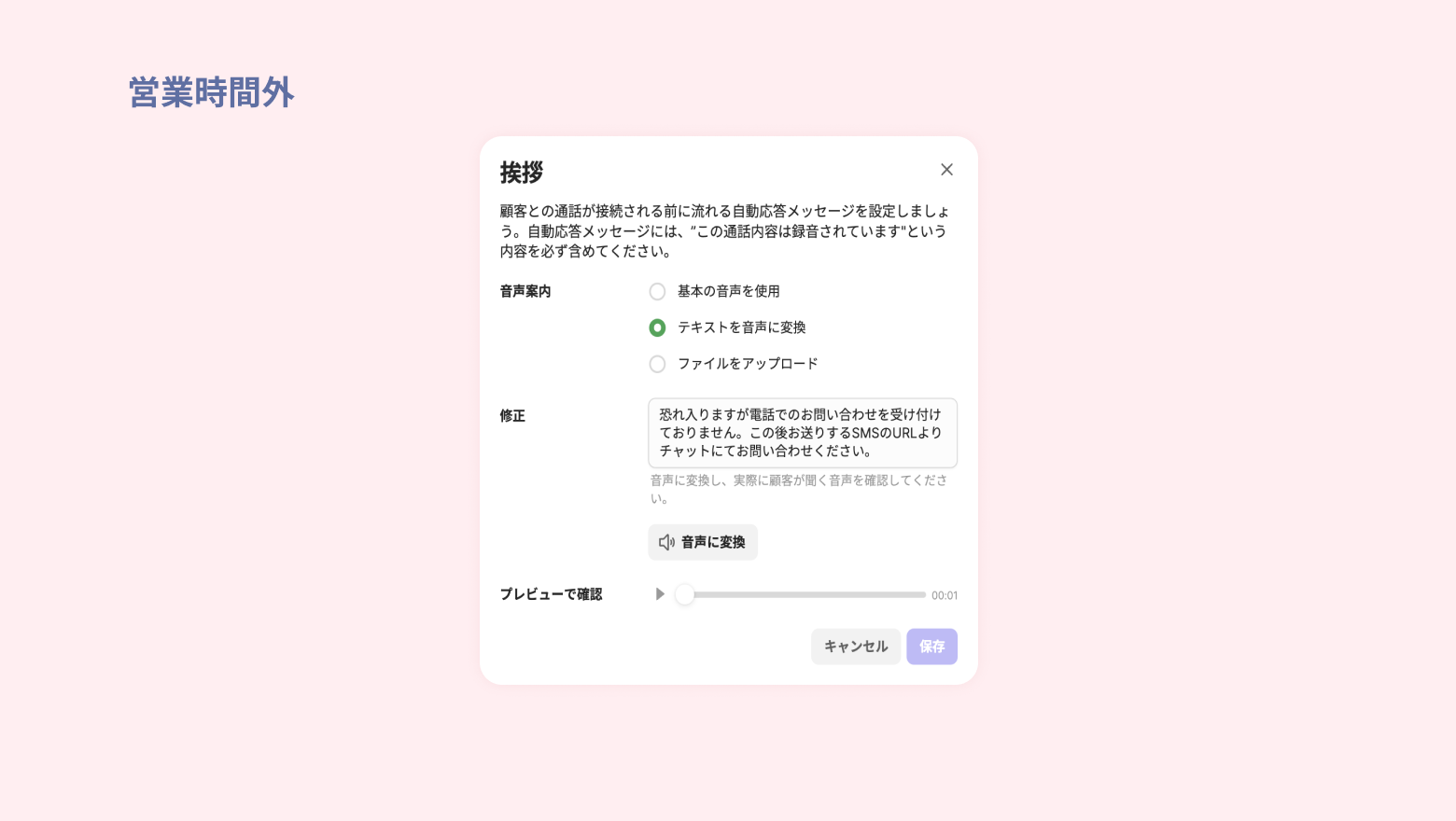 顧客に電話問い合わせを受け付けてないことを案内するために、案内音声を設定してください。この際、営業時間中と運営時間外では設定が異なりますので、画像をご参考ください。 [チャネル設定] - [外部サービス連携] - [電話] - [音声案内]