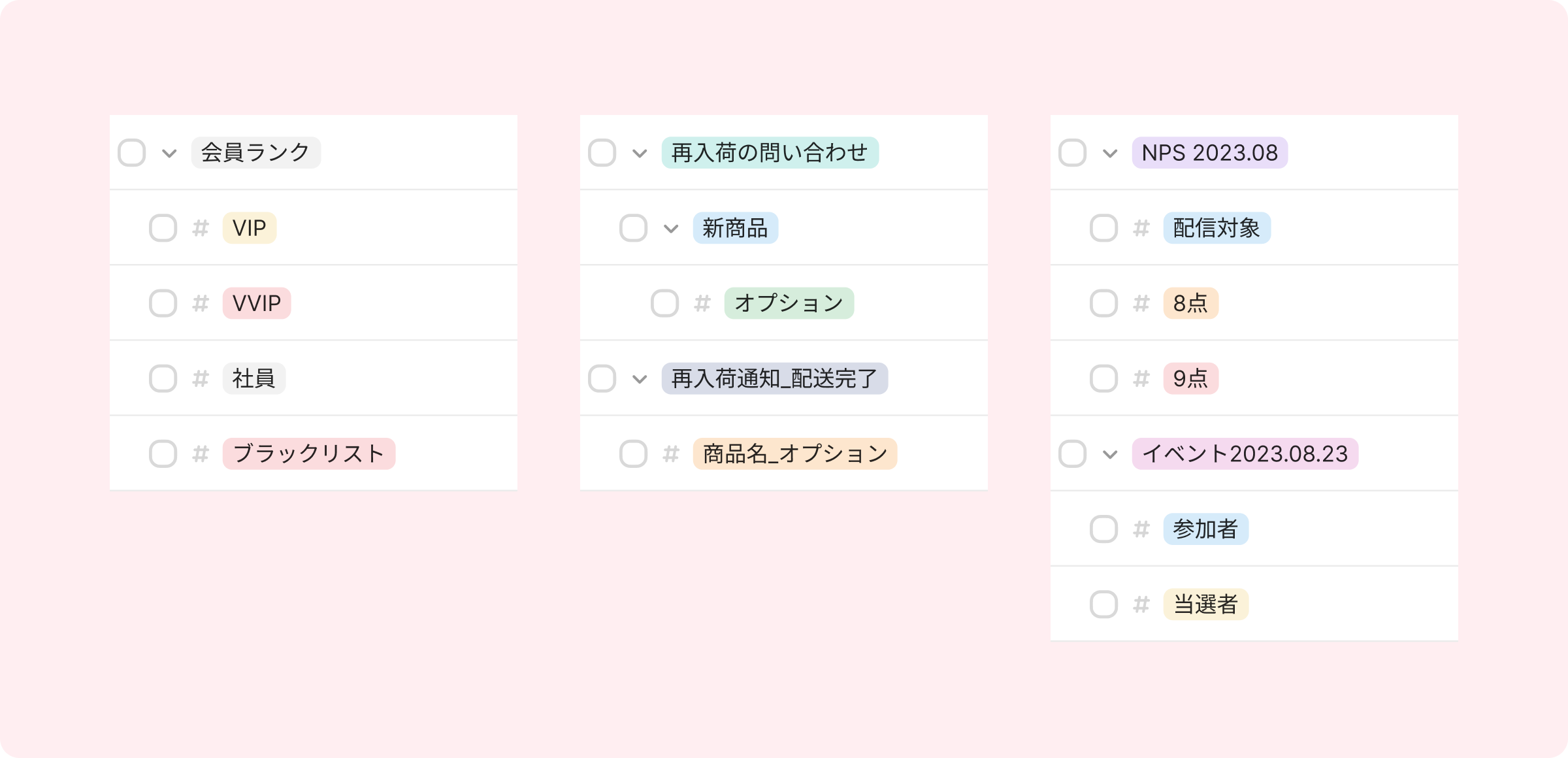 例)Aチャネルの顧客に [顧客区分/VIP]、[23夏イベント/当選]、[再入荷のお問い合わせ/リネンシャツ/M-アイボリー] など、デプス区分がされている複数の顧客タグを付けることができます。