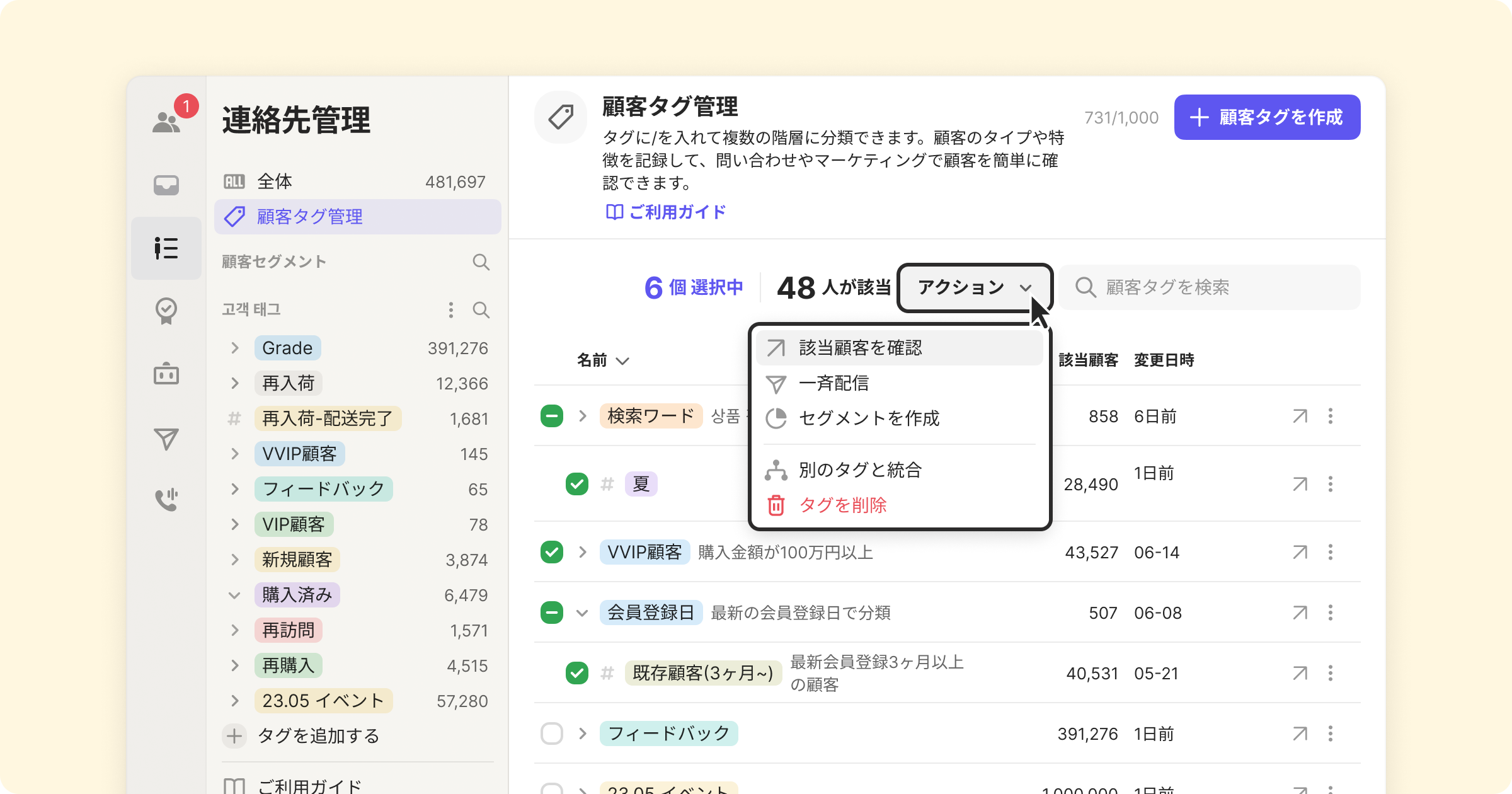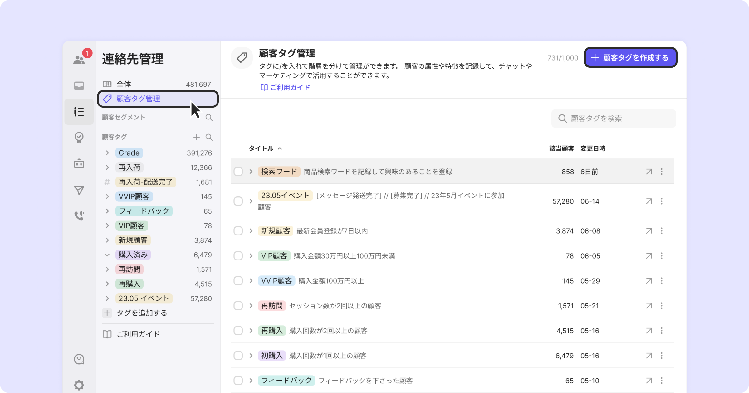 連絡先管理の左側のメニューからタグ付けされた顧客数を確認し、顧客タグを修正することができます。