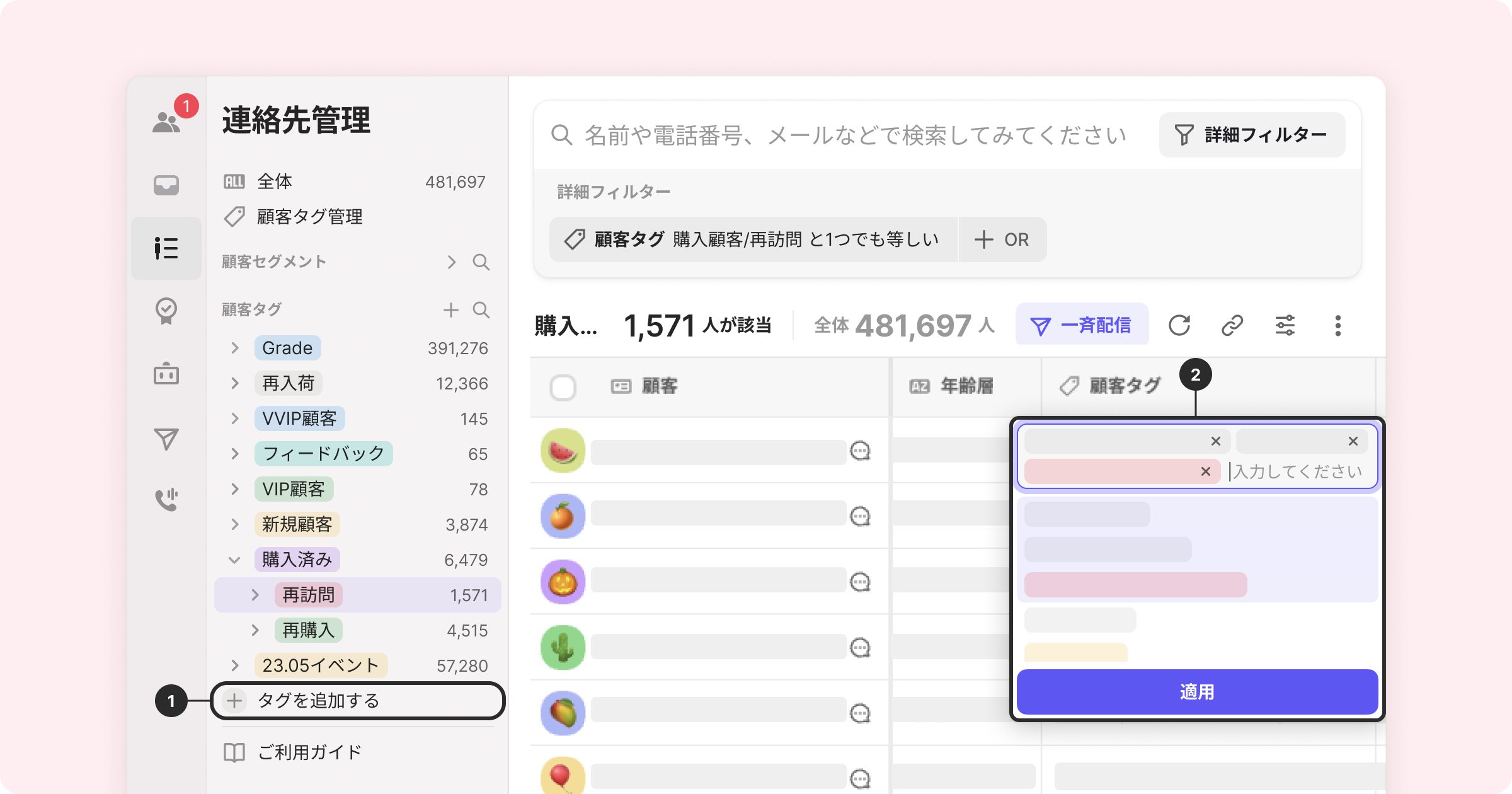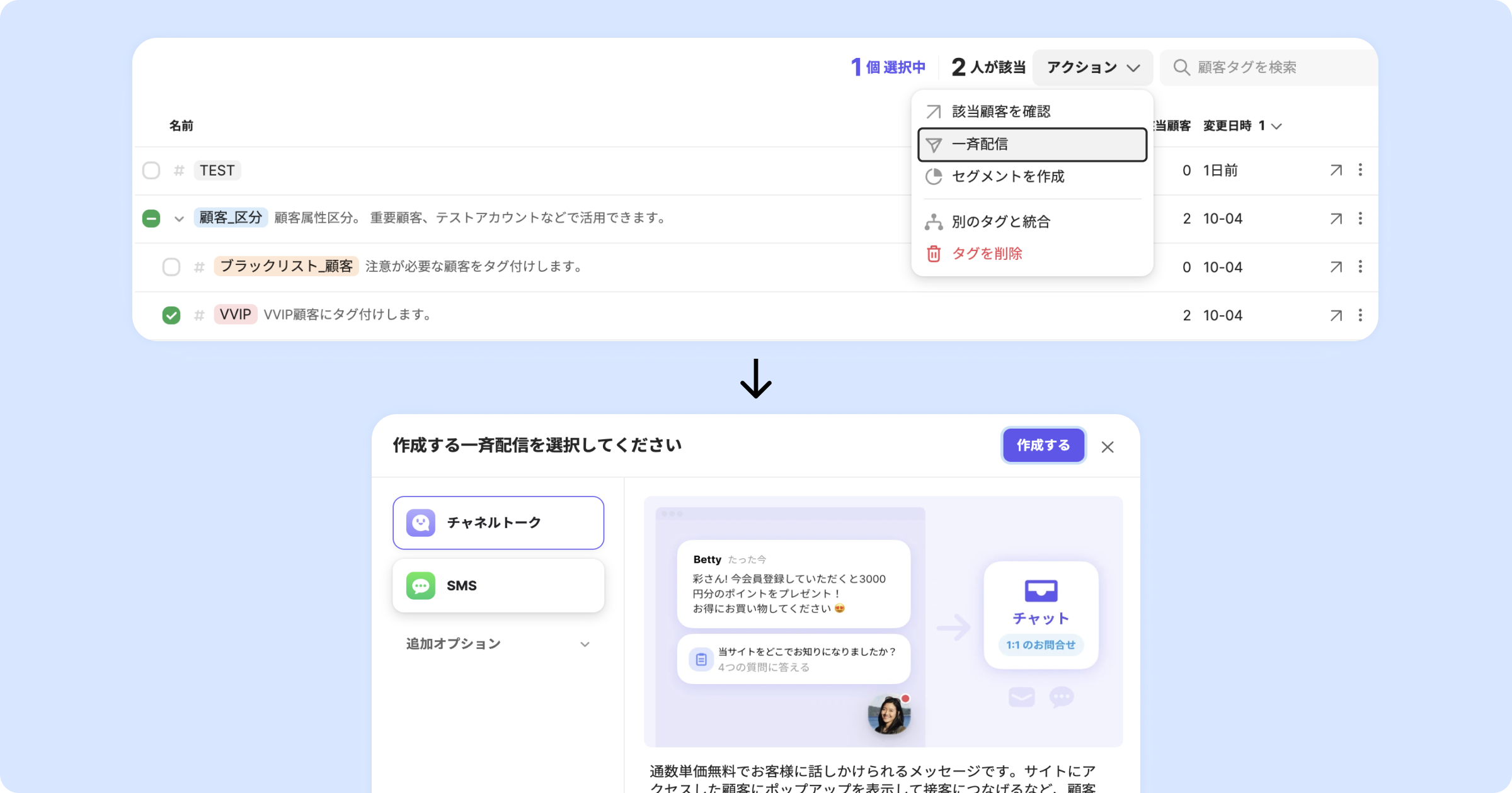 選択したタグが付けられた顧客を対象に一斉配信を送信できます。