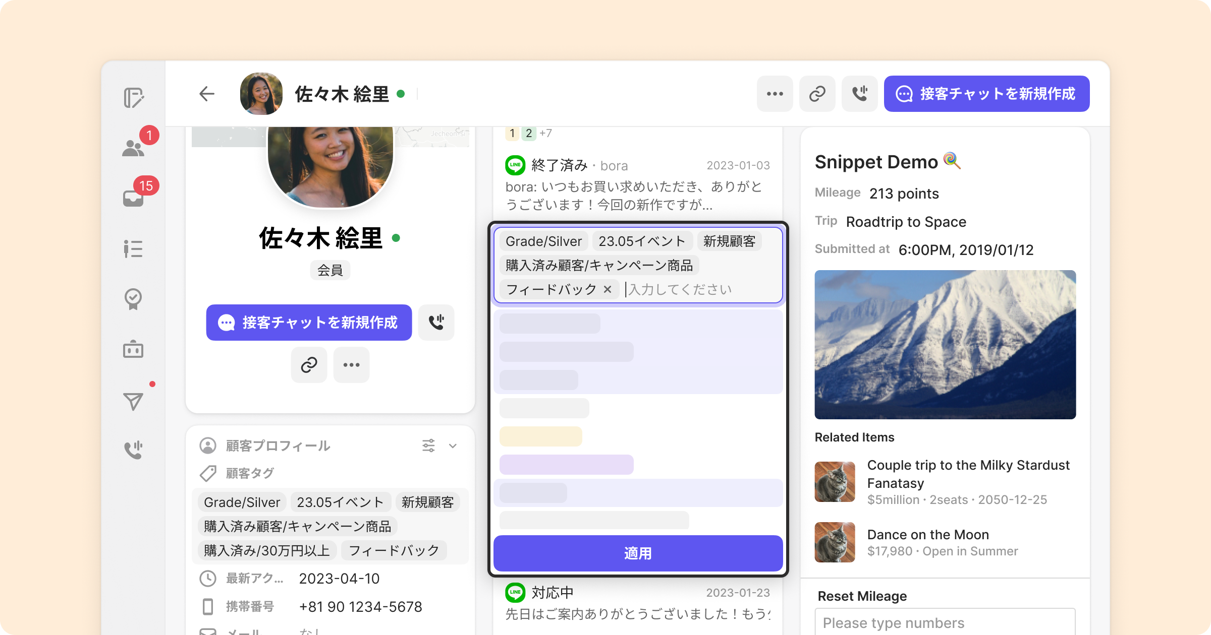 顧客タグのついた顧客は、問い合わせ時にどのようなタイプの顧客なのかの特徴を確認することができ、CRMをマーケティング機能で特定の顧客タグの付いた対象顧客を簡単に設置してメッセージを送ることもできます。
