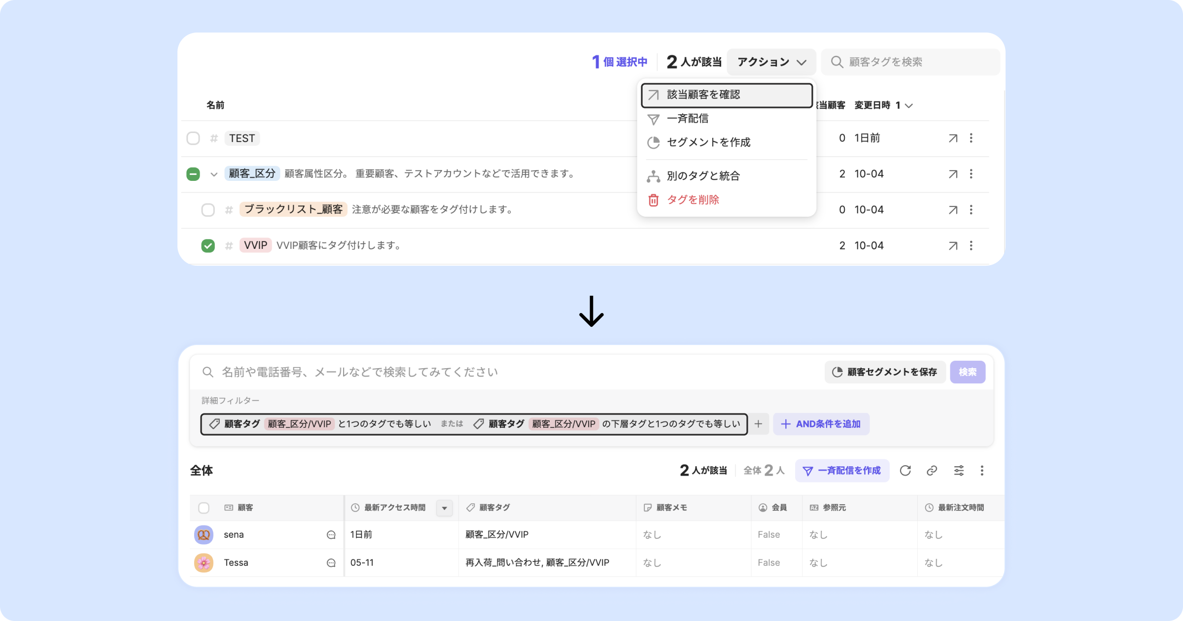 選択したタグが付けられた顧客をグループ化して管理できます。