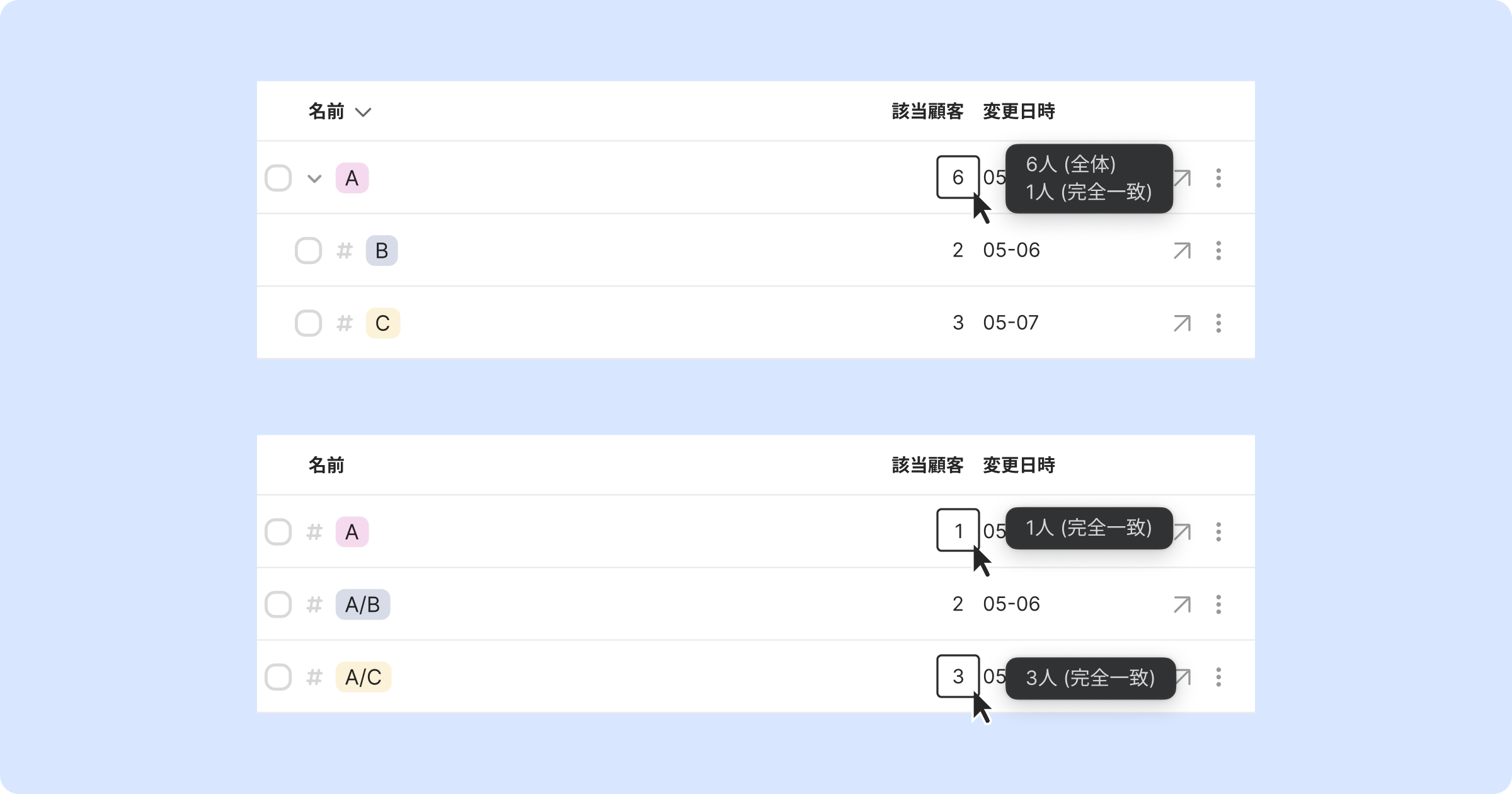 "#" で広がっているタグは、そのタグが付いた顧客の数を表示します。(正確に一致)
