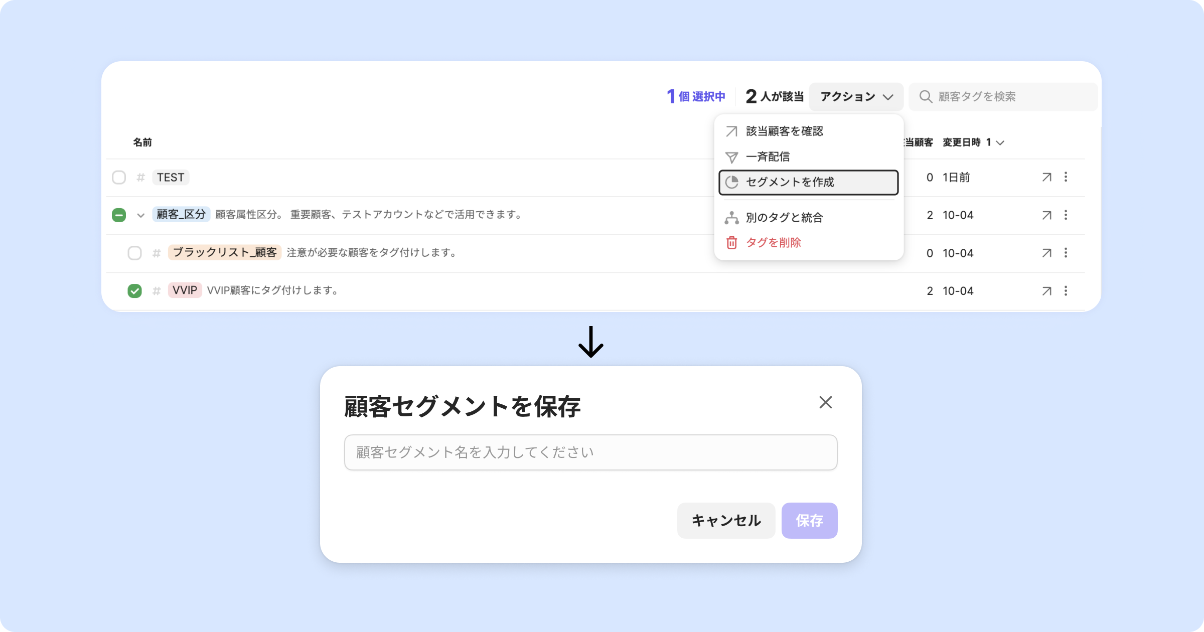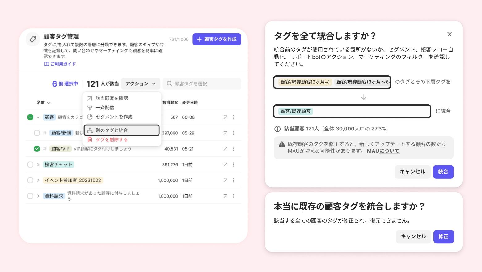 顧客タグの統合は、選択したタグを別のタグに併合させる機能です。選択されたタグの下層タグを含めて統合されます。