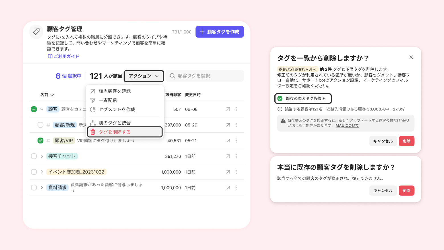 一覧からタグを削除後、顧客に付けられた既存のタグも一緒に削除できます。