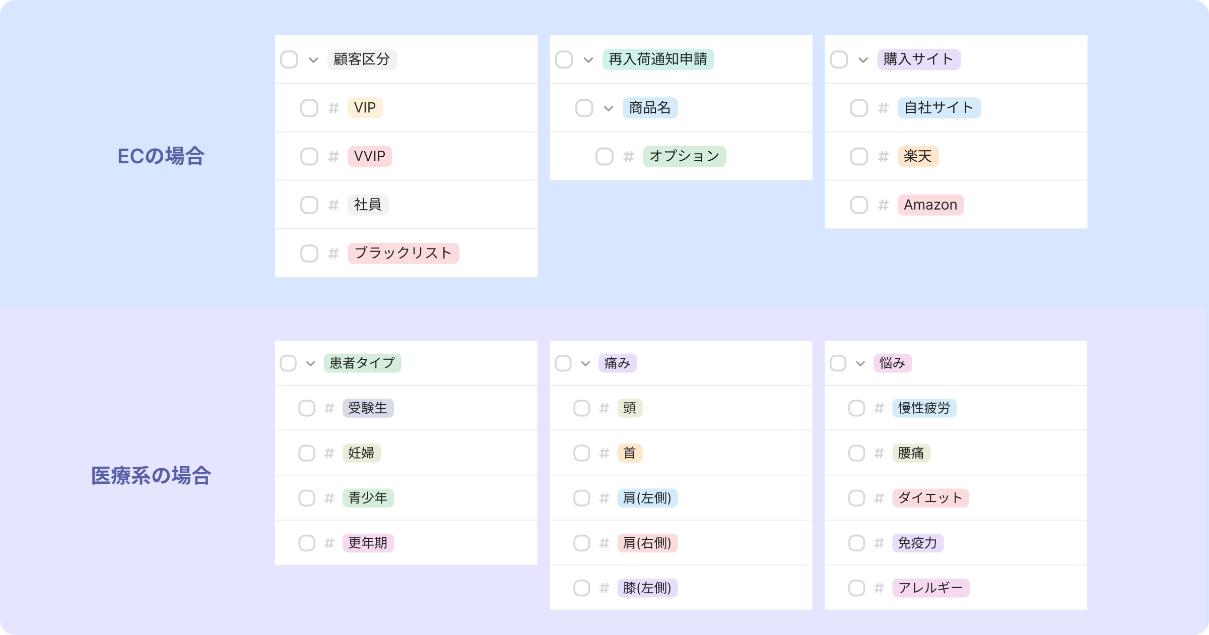 下の例のように、階層別に顧客タグを区分して設定することができます。
