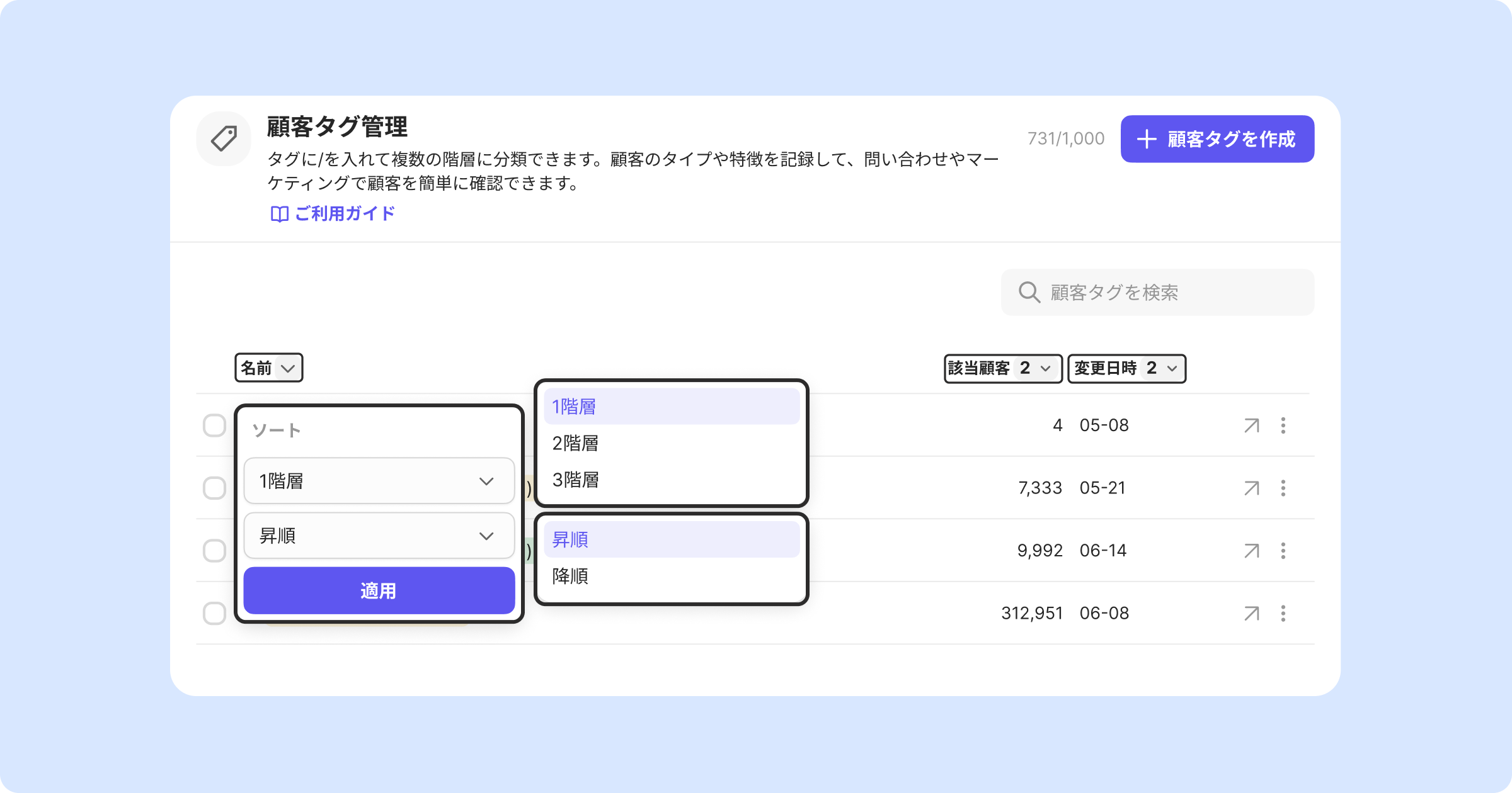 顧客タグ管理ページでタグ付けされた顧客数を確認し、顧客タグを作成および管理できます。