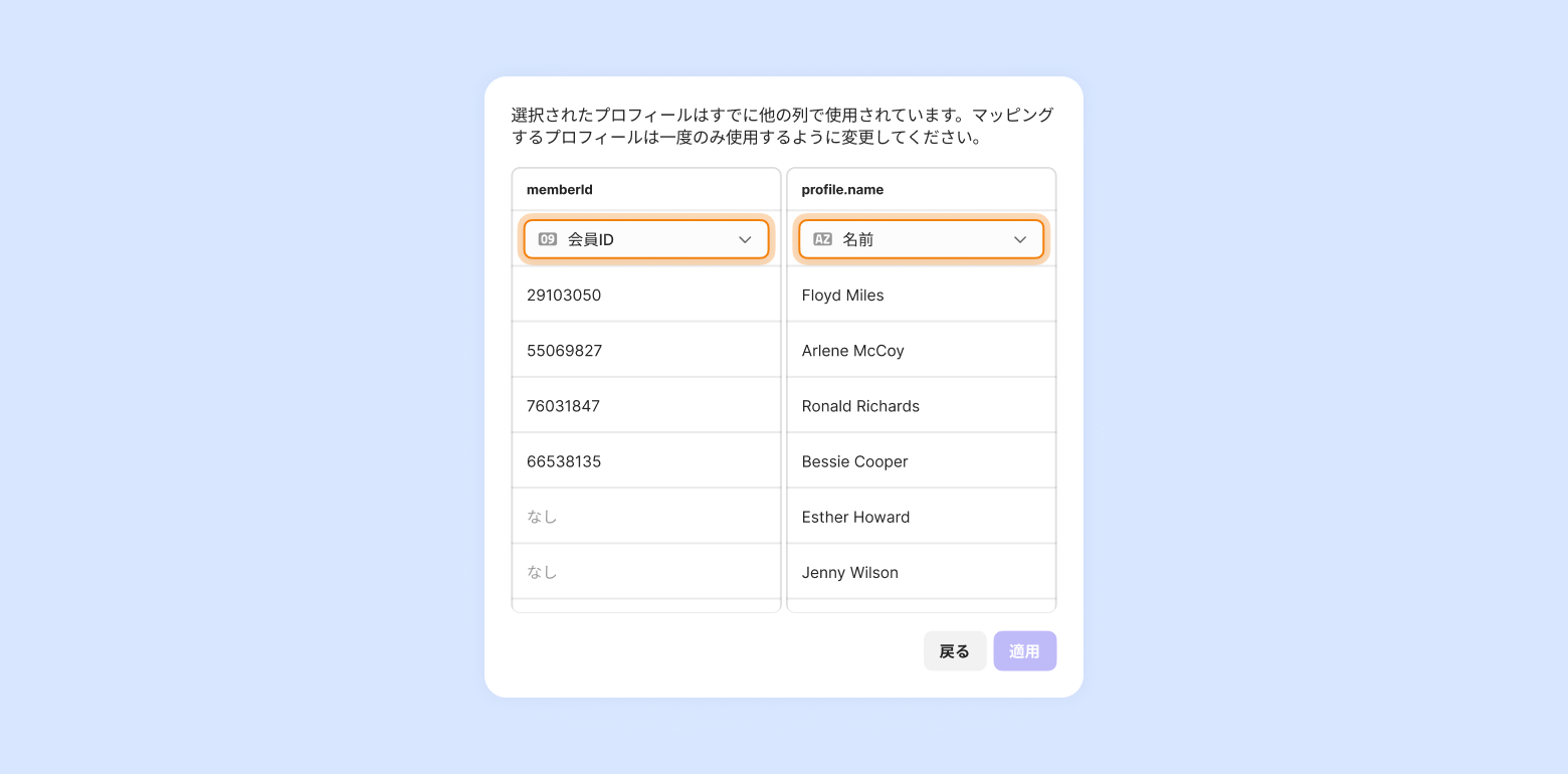 1つの顧客プロフィールはアップロードした項目に一度だけ使用できます。