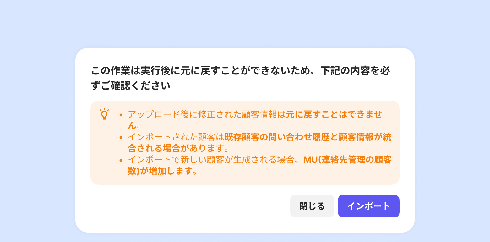 CSVアップロードでインポートした顧客情報は元の状態に戻すことができないため、慎重に作業してください。