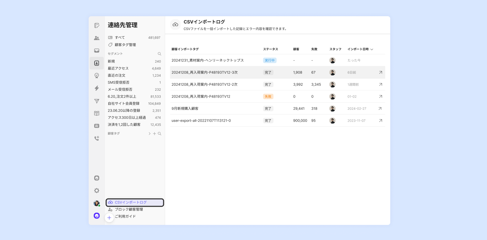 または、[連絡先管理] の左下にある [顧客インポートログ] をクリックすると確認できます。