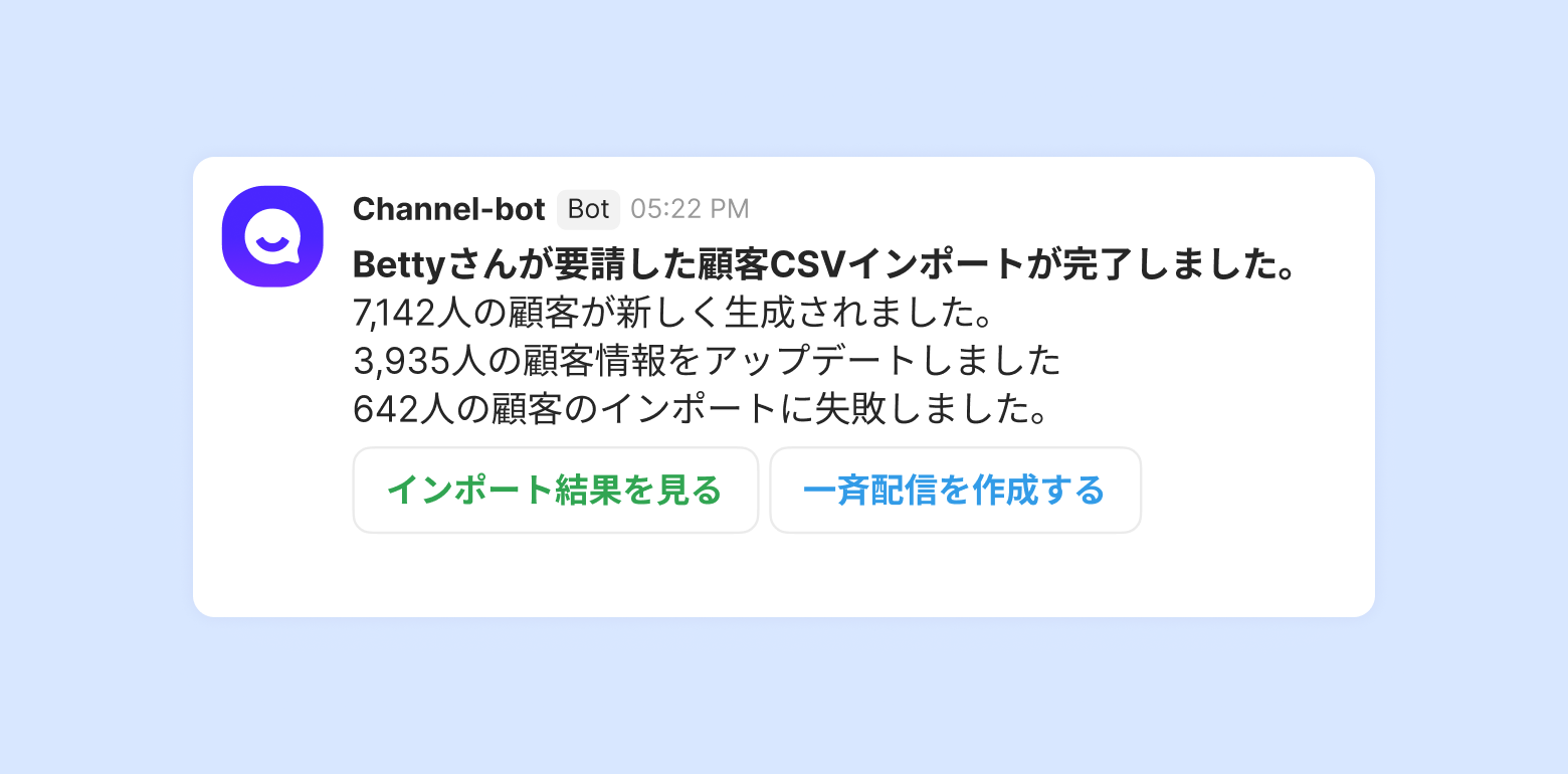 インポートが完了するとオーナーと要請したチームメンバーにボットメッセージで案内します。