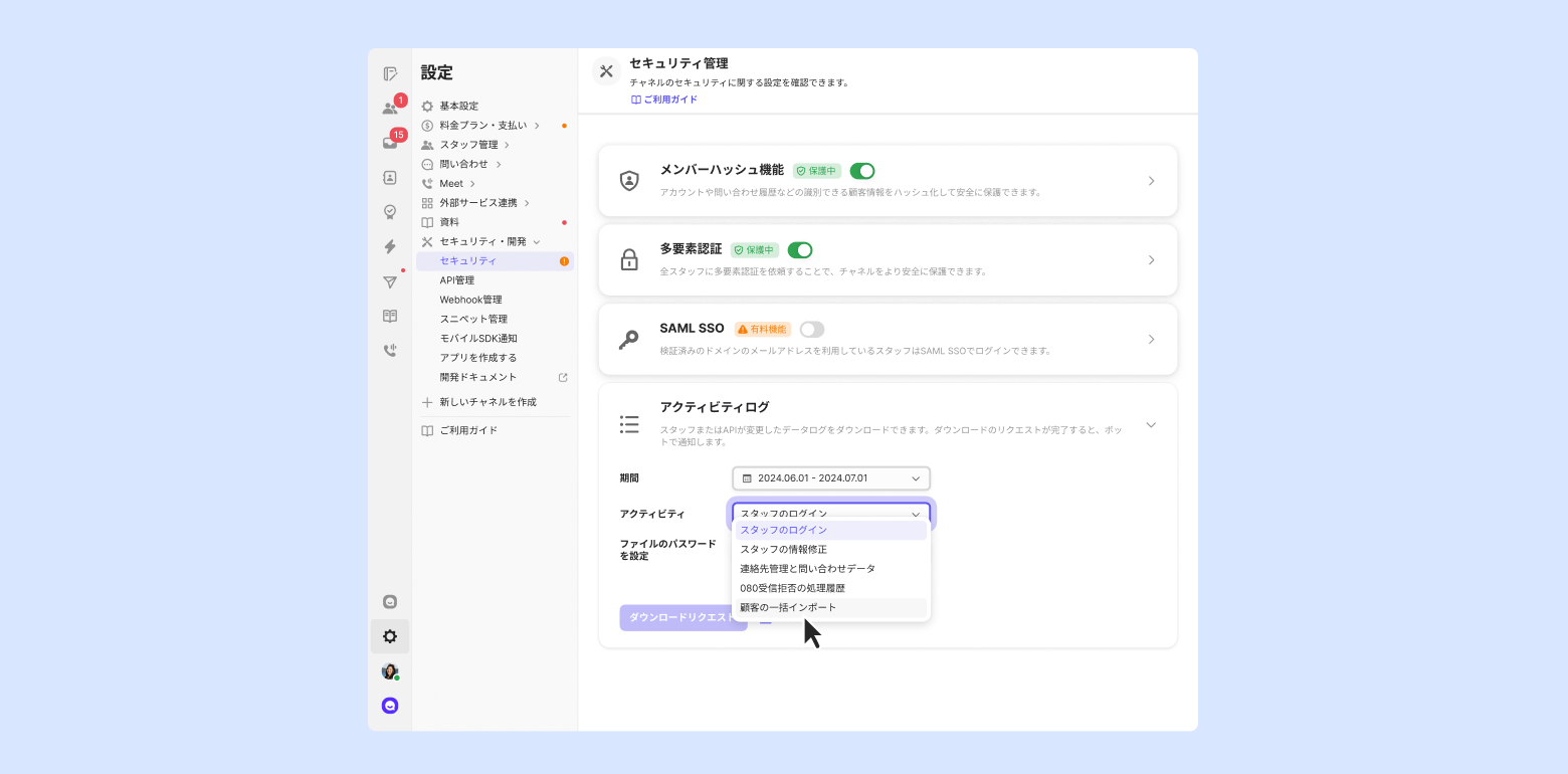 Enterpriseプラン+セキュリティパッケージを契約中の場合、[チームメンバーのアクティビティログ] - [顧客情報の修正] でも顧客CSVインポートの内容を確認できます。