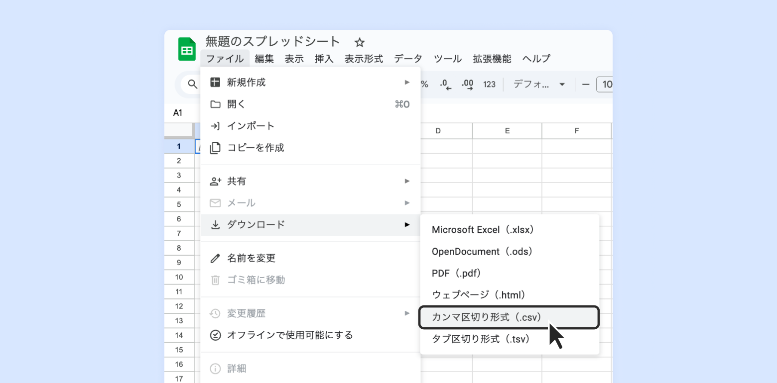 上段のメニューで [ファイル] - [ダウンロード] - [カンマ区切り形式 (.csv)] を選択する