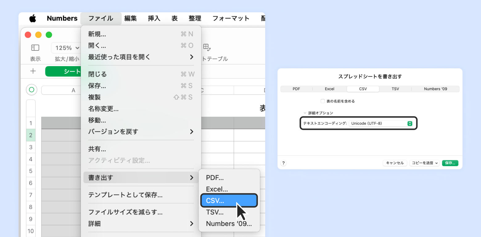 [ファイル] - [書き出す] - [CSV] をクリック
