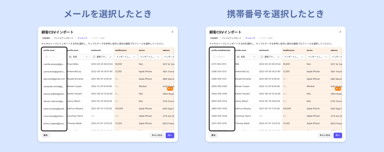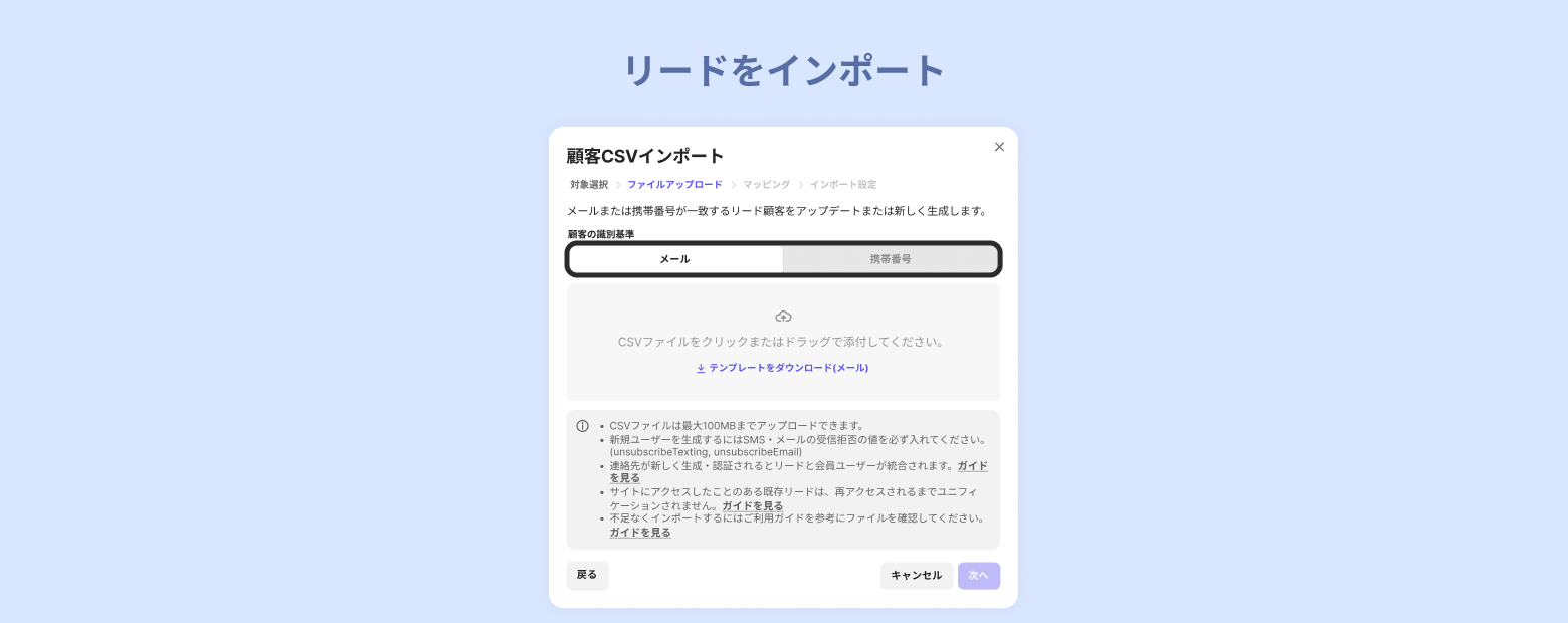 CSVファイルをアップロード後、メールまたは携帯番号のどちらで顧客情報を識別するかを選択します。