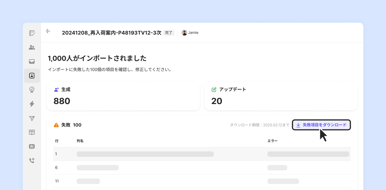 インポートに失敗した項目がある場合、Excelファイルをダウンロードして内容を修正後、CSV形式に変換して再度アップロードできます。
