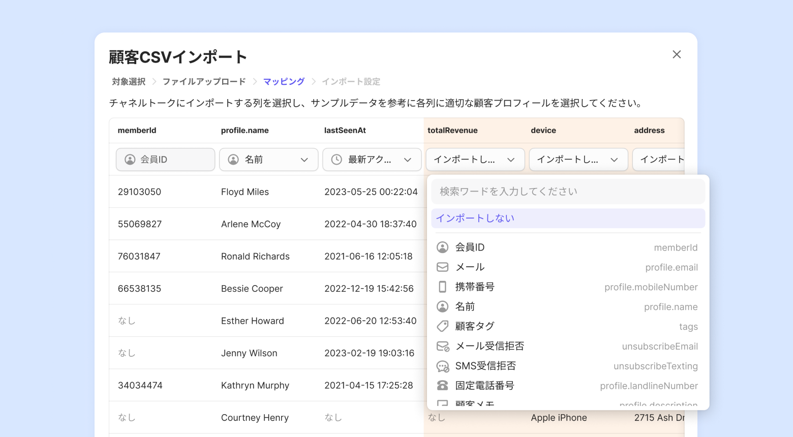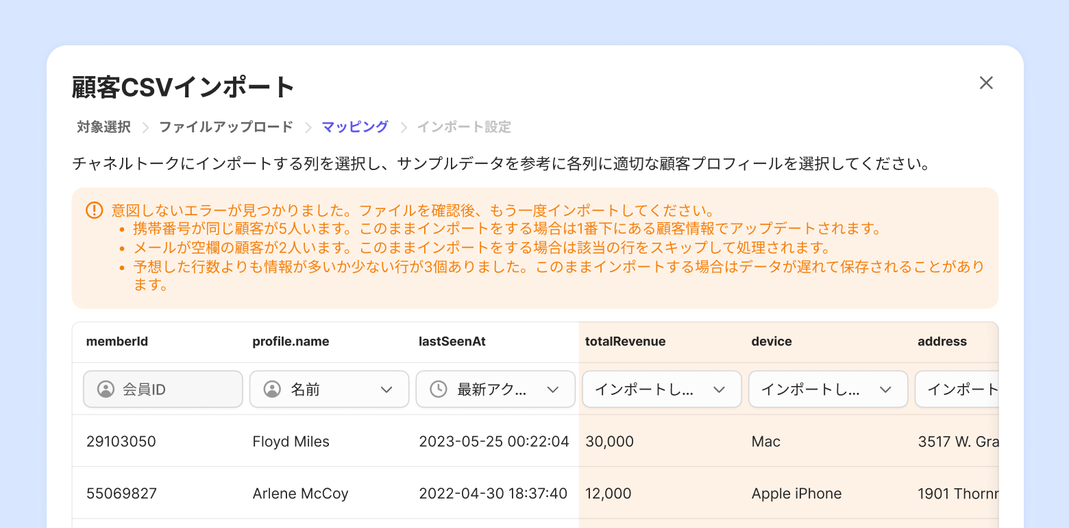 CSVファイルアップロード後、ファイルの列とチャネルトークの顧客プロフィールをマッピングします。