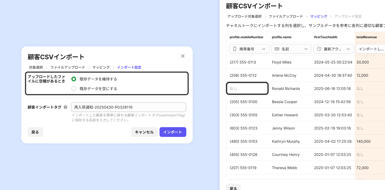 既存データを維持する:空欄を無視し、既存の顧客情報がそのまま維持されます。