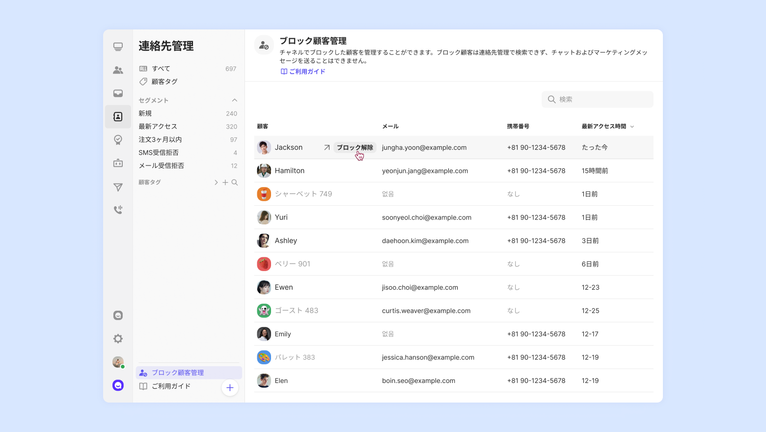 宣伝広告メッセージを頻繁に配信したり、問い合わせ対応中に暴言を吐くなどのブロックした顧客を管理することができます。
