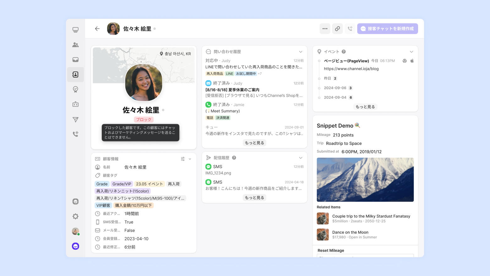 ブロックした顧客にチャットやマーケティングメッセージを送ることはできません。