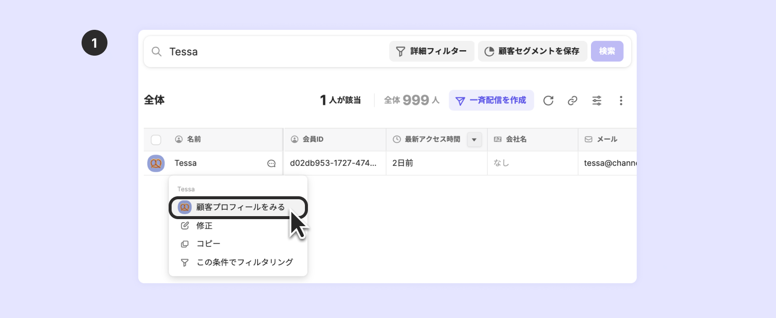 希望する顧客プロフィールがない場合は、顧客プロフィールの検索窓ですぐに作成できます。