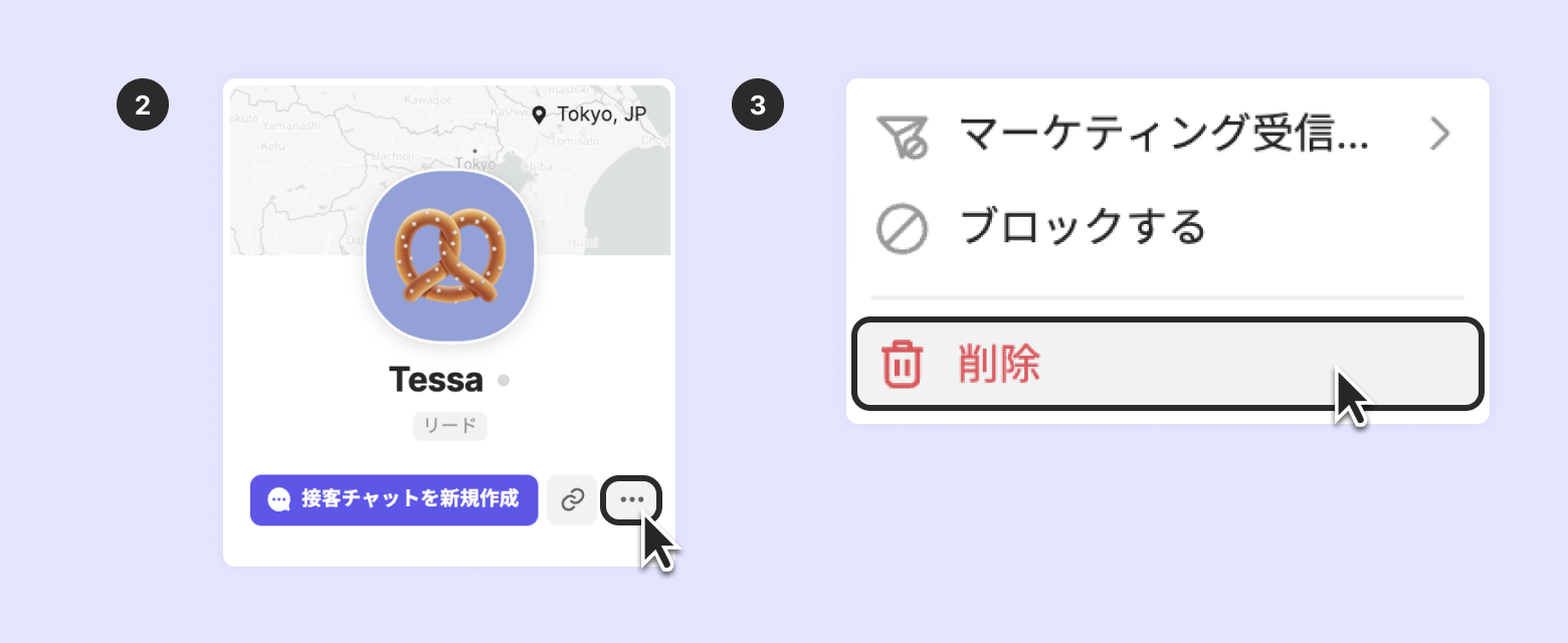 チームメンバーの役割に顧客削除権限が付与されている場合、顧客を削除することができ、削除後に復元することはできません。削除後、顧客の情報はすべて削除され、会話のメッセージ内容だけが残ります。