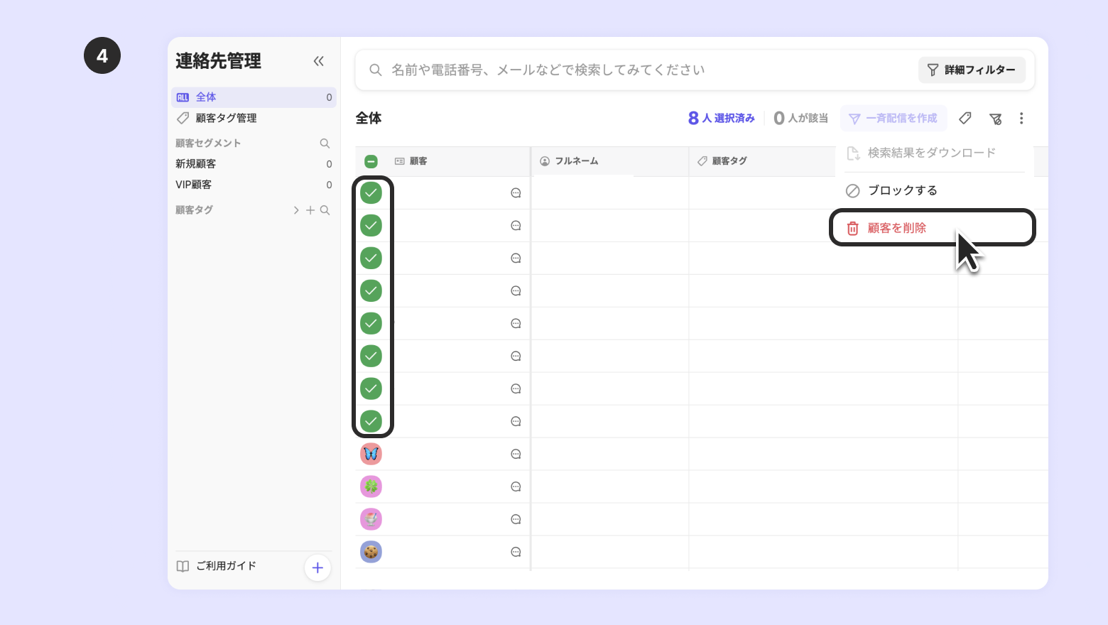 顧客一括で選択して削除することもできます。