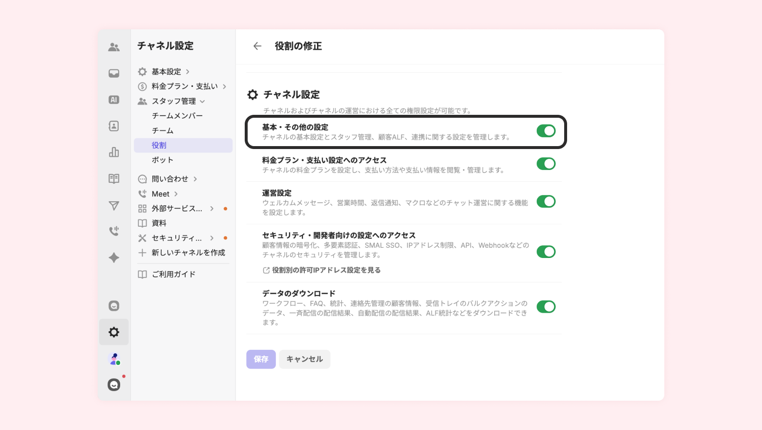[チャネル設定] - [チームメンバー管理] - [役割] - [基本・その他の設定] がONになっているチームメンバー