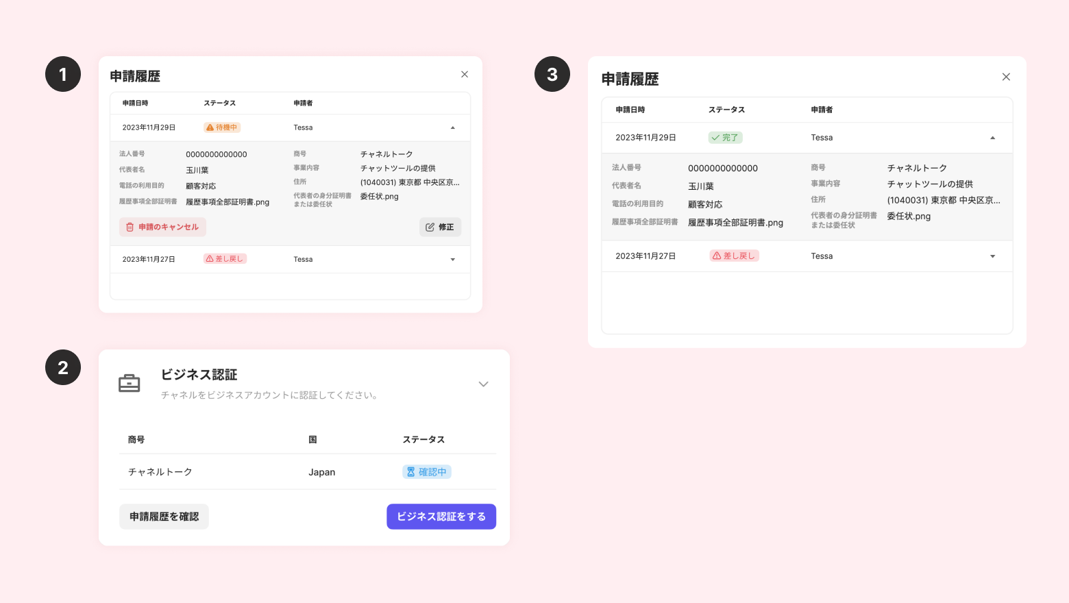 審査ステータスが [待機中] の場合は、入力した情報を修正したりビジネス認証の申請をキャンセルすることができます。情報の修正は認証をした申請者のみが可能で、申請のキャンセルはビジネス認証の申請権限を保有する全てのチームメンバーが可能です。