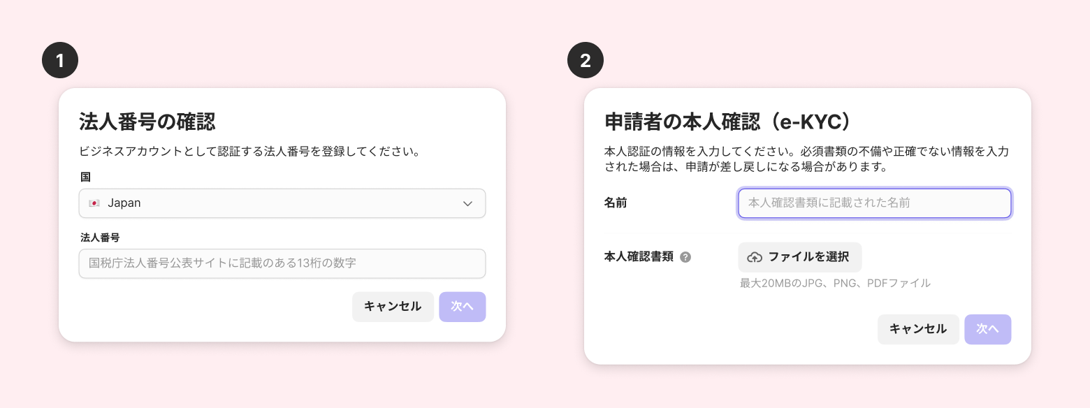 チャネルトークは電話転送サービスを行う事業者(特定事業者)の義務として、マネーロンダリングおよびテロ資金供与対策を防止するため、犯罪収益移転防止法に基づき、ビジネス認証(申請者の本人確認 e-KYC、法人確認)を行なっております。