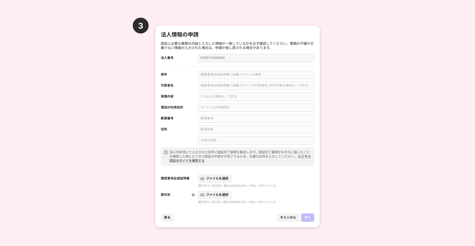 認証完了書類がお手元に届いたことを確認した後にビジネス認証の申請が完全に完了するため、認証の申請の際に正確な法人所在地(住所)を入力してください。 ※法人所在地の住所は登記簿謄本に記載のある、本店もしくは支店をご入力ください。