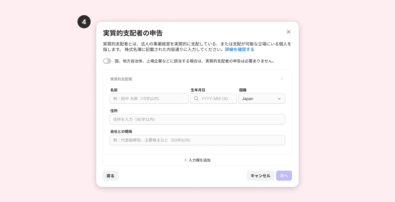 国、地方自治体、上場企業、上場企業の子会社以外の法人は「実質的支配者」の申告が必要です。(→実質的支配者を見る)